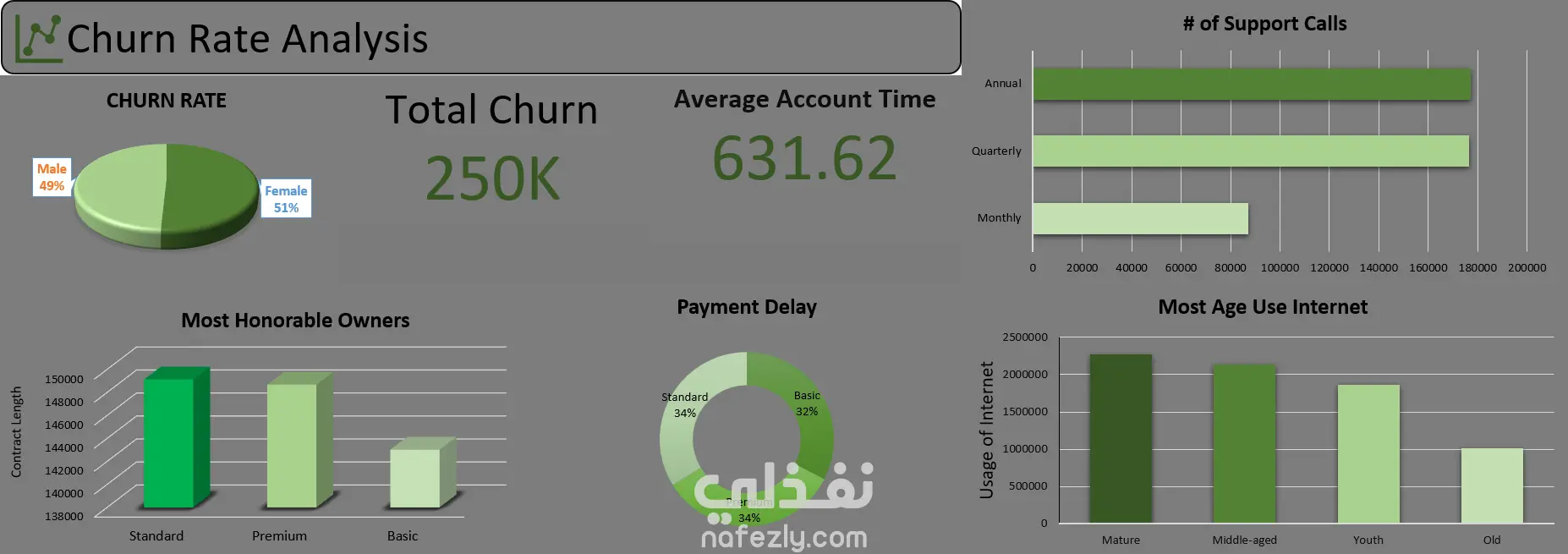 مشروع تحليل معدل فقدان العملاء: أجرينا تحليلًا لفقدان العملاء باستخدام برنامج إكسل، وحددنا أنماطًا رئيسية مثل معدل فقدان عملاء يبلغ 250 ألفًا، وتوزيعًا متوازنًا بين الجنسين، واستخدامًا مرتفعًا للإنترنت بين العملاء البالغين. قدّمنا رؤىً حول تأخيرات الدفع، ومكالمات الدعم، واستراتيجيات الاحتفاظ بالعملاء لتحسين رضاهم.