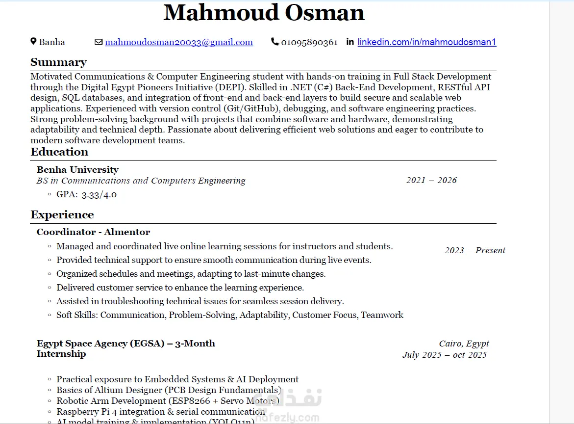 أقدّم خدمة إعداد وكتابة CV/Simple Resume احترافي مصمم خصيصًا ليتوافق مع أنظمة ATS (Applicant Tracking System) لضمان مرور سيرتك الذاتية بنجاح عند التقديم على الوظائف، مع إبراز خبراتك ومهاراتك بشكل منظم وجذاب. ما ستحصل عليه: سيرة ذاتية احترافية متوافقة مع نظام ATS. تنسيق أنيق وواضح يعكس خبراتك ومهاراتك. صياغة قوية وجذابة تلائم متطلبات الوظائف. إمكانية تخصيص البروفايل أو الملخص المهني بما يناسب مجالك. ملف جاهز بصيغة PDF و Word. هدفي هو مساعدتك في التميز أمام مسؤولي التوظيف وزيادة فرصك في الحصول على مقابلات عمل.