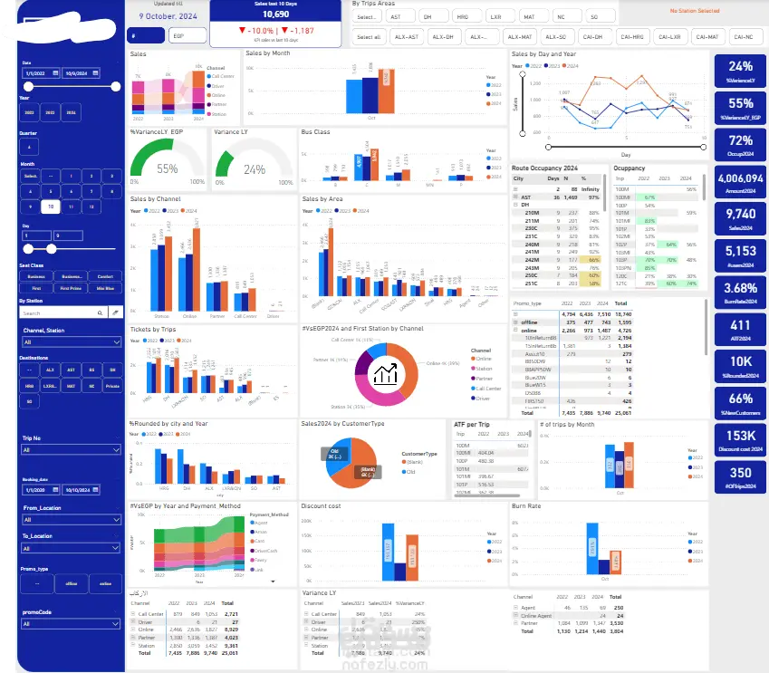 داشبورد تحوي بيانات شركة تعمل في مجال النقل الجماعي ومن خلالها يتم تقييم الأداء مقارنة بالتارجت ومقارنة بالسنين الماضية, كذلك مقارنة محطات البيع المختلفة ومعرفة سبب القصور في بعضها لاتخاذ الاجراء المناسب.