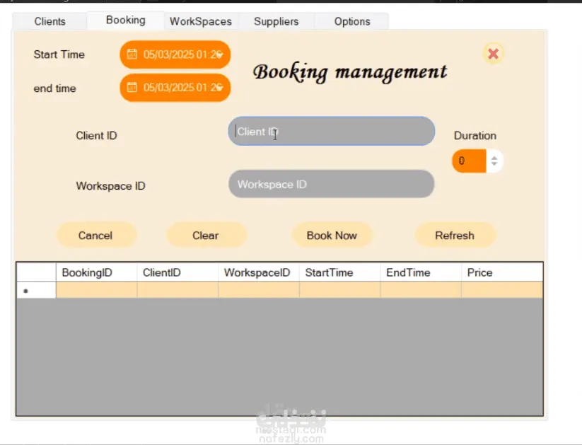 Work Space Management System هو نظام متكامل لإدارة مساحات العمل المشتركة (Co-Working Spaces) يهدف إلى تسهيل عملية تنظيم العملاء والحجوزات والخدمات الإضافية بشكل احترافي وسهل الاستخدام. النظام بيشمل: إدارة العملاء (Client Management): تسجيل بيانات العملاء. متابعة سجلات الزيارات السابقة. البحث والتصفية بسهولة. إدارة الحجوزات (Booking Management): حجز المكاتب أو القاعات. تحديد مدة الحجز وحسابه تلقائيًا. إمكانية تعديل أو إلغاء الحجز. إدارة مساحة العمل (Workspace Management): تحديد أنواع المكاتب/القاعات (مشترك – خاص – قاعة اجتماعات). متابعة توفر الغرف والمكاتب في الوقت الفعلي. إدارة الموردين (Suppliers): حفظ بيانات الموردين للخدمات (إنترنت – أدوات مكتبية – ضيافة). تنظيم العقود والفواتير. إعدادات النظام (System Options): تعديل نظام التسعير بناءً على نوع العميل أو نوع الحجز. تقارير يومية / شهرية للإيرادات. صلاحيات مختلفة للمستخدمين (مدير – موظف استقبال). الفوائد: تقليل الوقت والمجهود في إدارة العملاء والحجوزات. زيادة كفاءة استخدام مساحات العمل. تقارير دقيقة تدعم اتخاذ القرار. واجهة سهلة الاستخدام تساعد الموظفين على إنجاز المهام بسرعة.