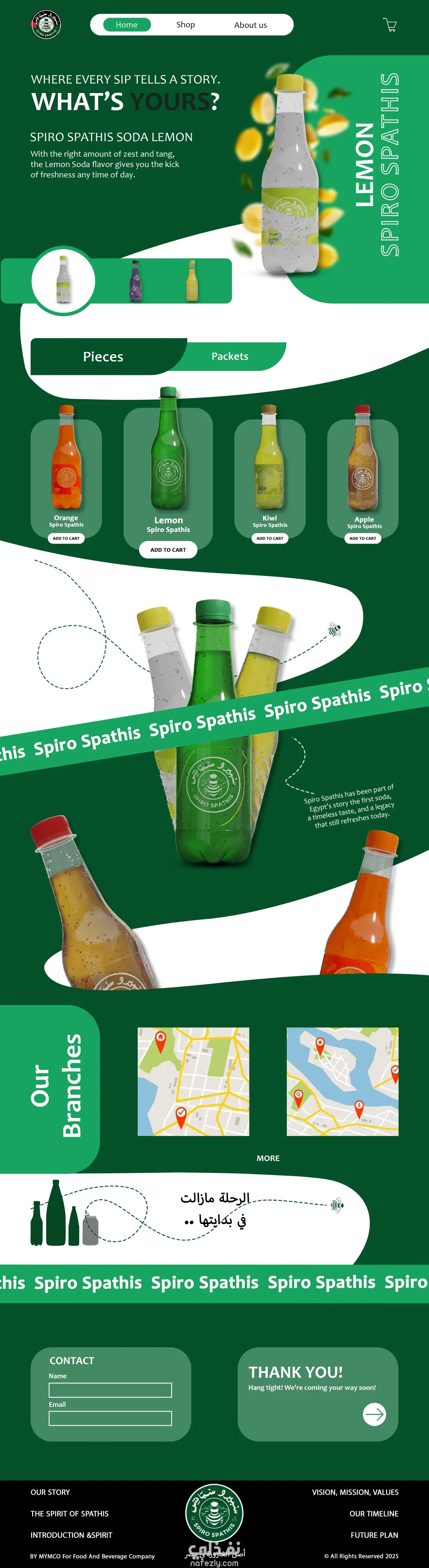 مشروع إعادة تصميم واجهة لموقع مشروبات غازية مصرية عريقة "سبيرو سباثيس". الهدف كان إعطاء العلامة التجارية طابع عصري مع الحفاظ على روحها الكلاسيكية. -الألوان والهوية: استخدام الأخضر والأصفر كلون أساسي يعكس النكهة المنعشة والهوية التاريخية للمنتج. -الهيكل: تصميم صفحة هبوط (Landing Page) واضحة وسهلة التصفح، تتضمن (المنتجات – الفروع – التواصل). -المنتجات: إبراز النكهات المختلفة بطريقة منظمة مع إمكانية الإضافة إلى عربة الشراء. -التجربة البصرية: دمج صور الزجاجات بطريقة جذابة لتعكس الانتعاش والحيوية. -التجربة التفاعلية: إضافة فورم للتواصل وزر شراء مباشر لتحسين تجربة المستخدم وزيادة التفاعل. -النتيجة: موقع حديث، مرتب وسهل الاستخدام يعكس تاريخ المشروب العريق ويشجع المستخدم على تجربة المنتجات أونلاين.