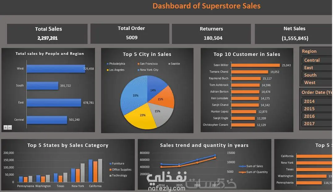 عمل عبارة عن لوحة معلومات لمبيعات متجر ضخم (Superstore Sales Dashboard) تعرض: