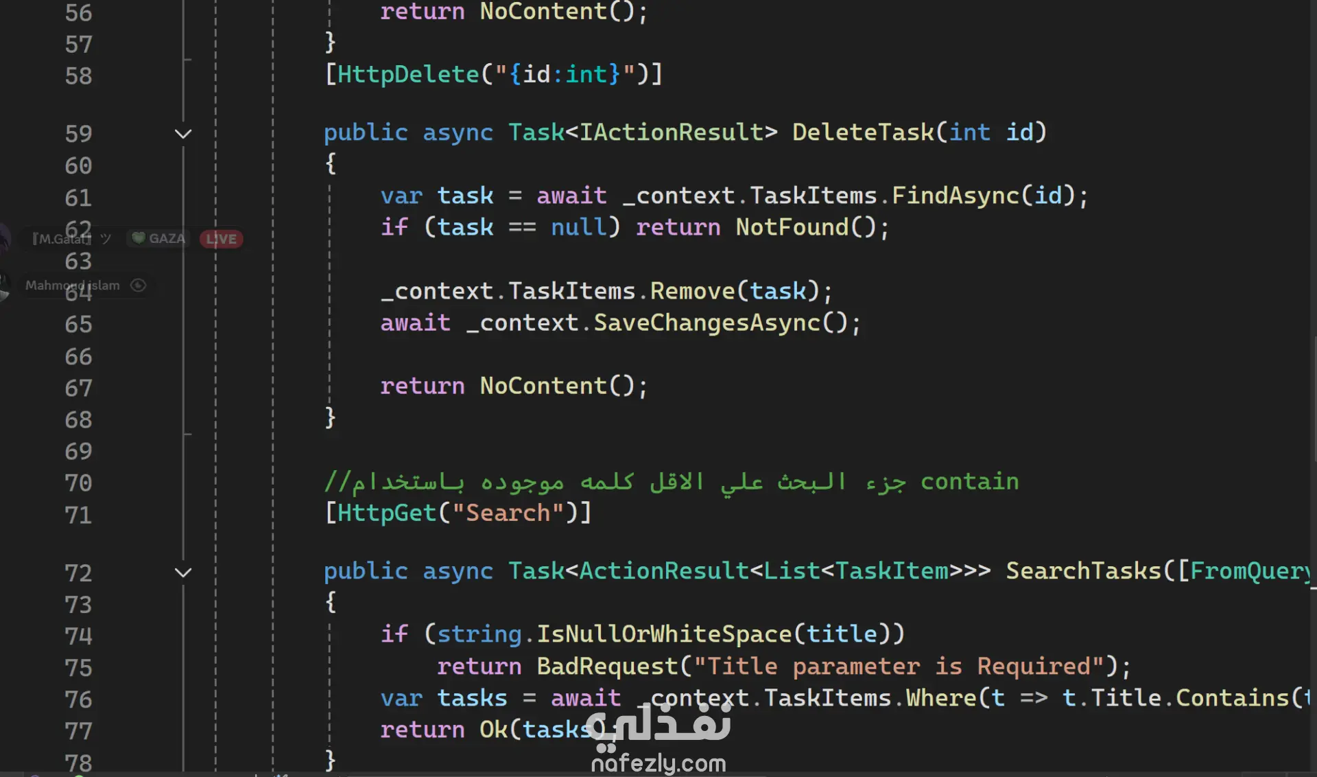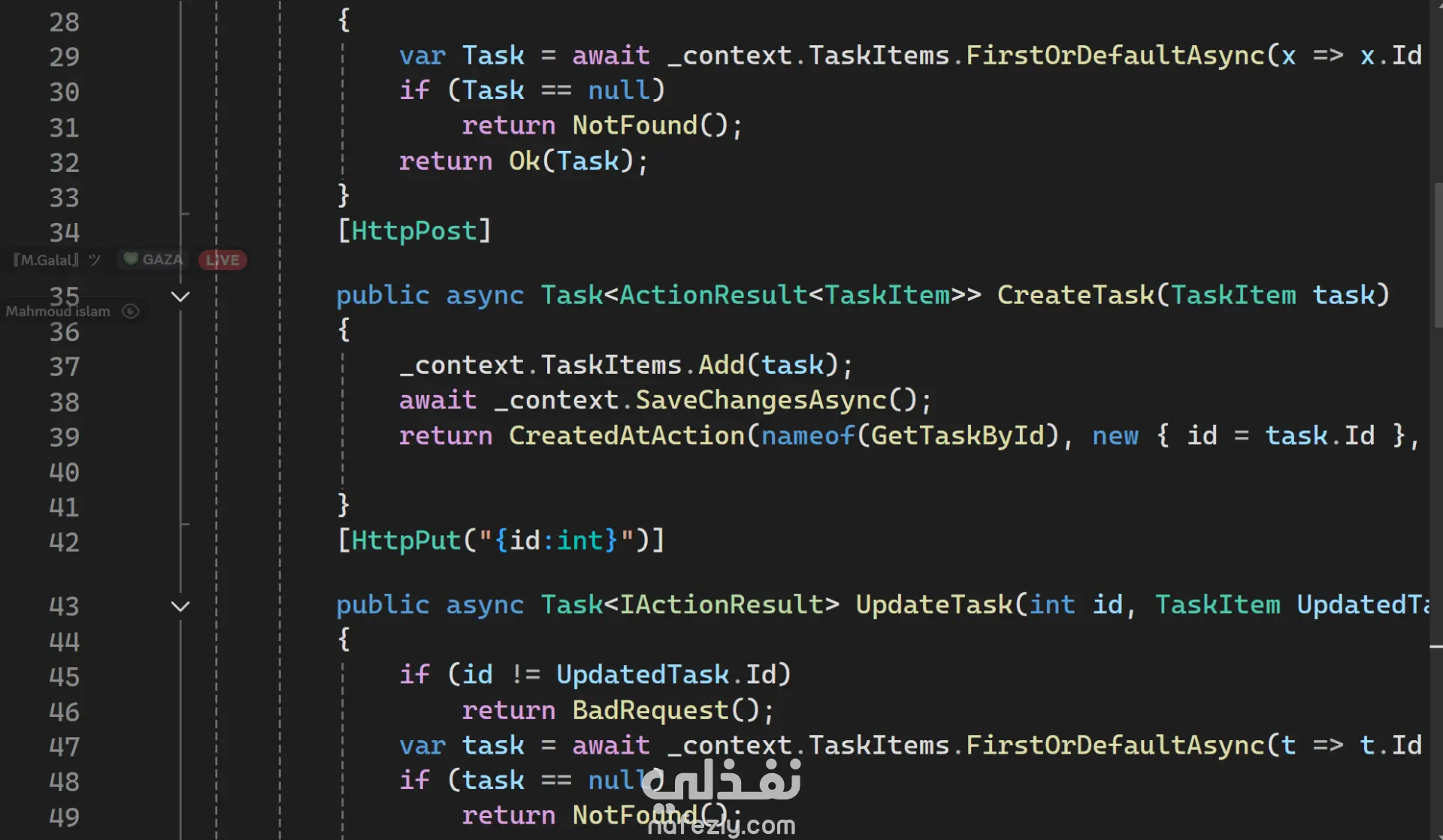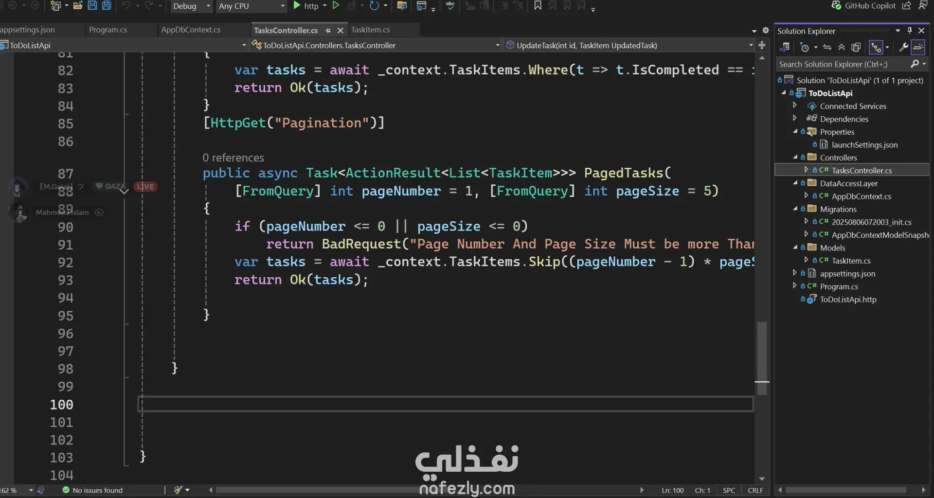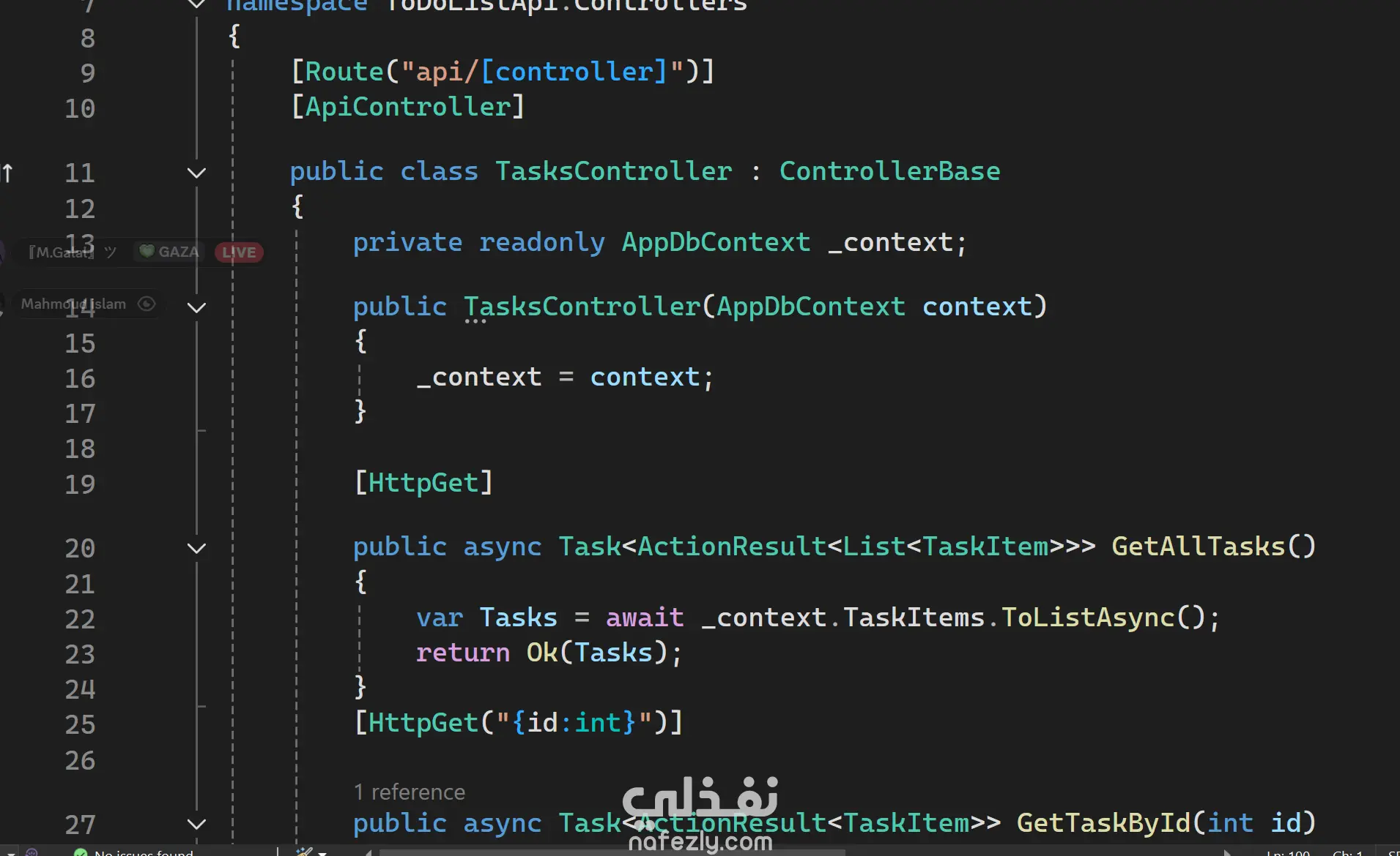 قمت بتطوير واجهة برمجية (RESTful API) لإدارة قائمة مهام (ToDo List) باستخدام ASP.NET Core مع Entity Framework Core. المشروع متكامل ويدعم العمليات الأساسية CRUD بالإضافة إلى مميزات متقدمة مثل: 🔹 إدارة المهام إضافة، تعديل، حذف، وجلب كل المهام. جلب مهمة محددة عبر المعرّف (ID). 🔹 خصائص متقدمة البحث في العناوين باستخدام Contains. فلترة المهام حسب حالة الإنجاز (مكتملة / غير مكتملة). تقسيم النتائج إلى صفحات (Pagination) لدعم الأداء. 🔹 التقنيات المستخدمة ASP.NET Core Web API Entity Framework Core LINQ Queries قاعدة بيانات SQL 🔹 الهدف من المشروع توفير نظام API جاهز يمكن دمجه مع أي واجهة مستخدم (موقع ويب، تطبيق موبايل). تطبيق عملي لمفاهيم Clean API Design وإدارة البيانات عبر EF Core. 🟢 هذا المشروع يوضح قدرتي على: تصميم وتنفيذ APIs احترافية باستخدام .NET العمل مع قواعد البيانات وربطها بالـ Backend إضافة خصائص عملية (بحث – فلترة – Pagination) تجعل النظام أكثر مرونة وقابلية للتوسع