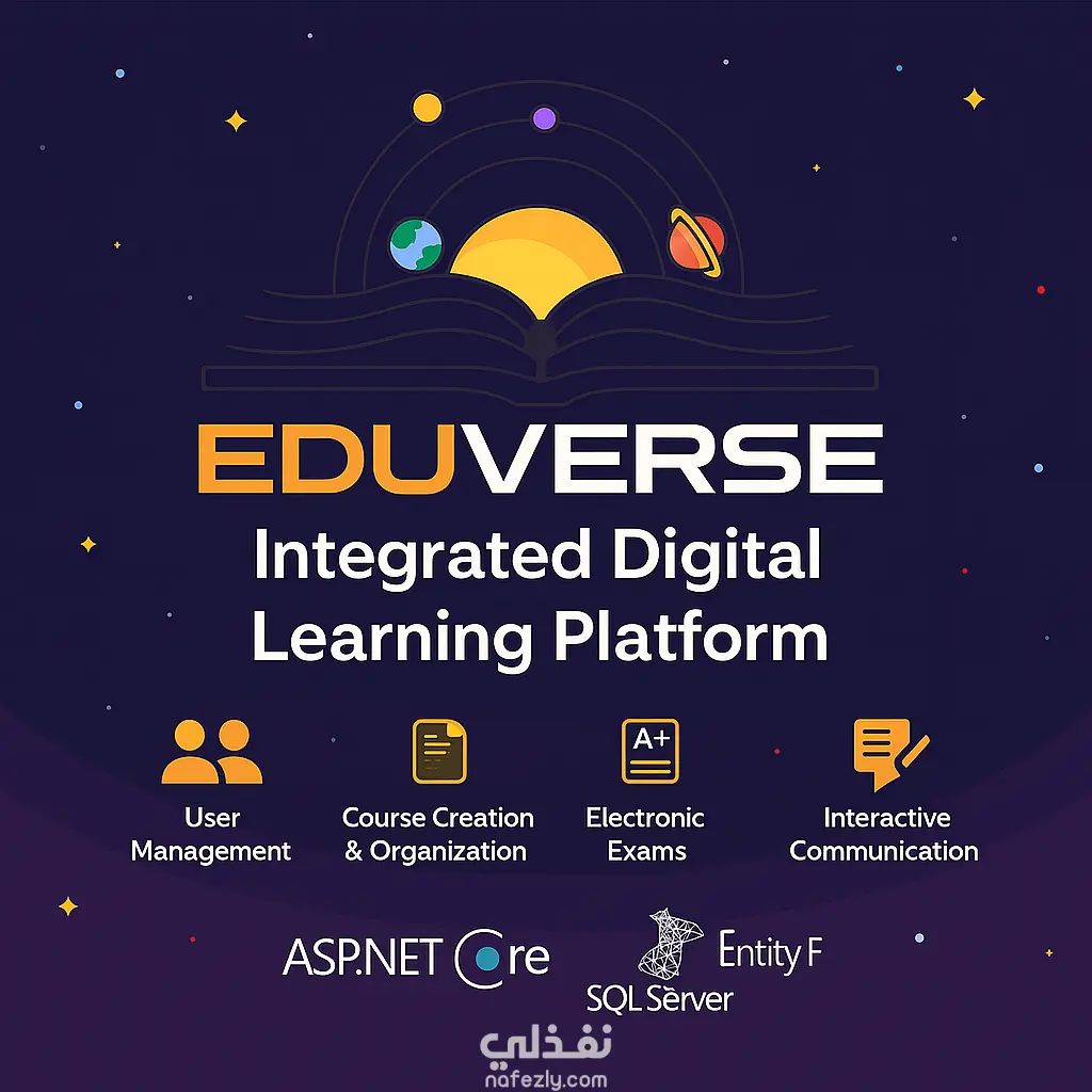 نظام EduVerse هو منصة تعليمية إلكترونية متكاملة تم تطويرها لتسهيل العملية التعليمية وتقديم تجربة تعليم رقمي متكامل يخدم الطلاب والمعلمين. يشمل النظام إدارة المستخدمين (طالب ومعلم)، وإنشاء وتنظيم المقررات وربطها بالطلاب والمعلمين، بالإضافة إلى نظام امتحانات إلكترونية يدعم إنشاء الاختبارات وتصحيحها تلقائيًا مع عرض النتائج بشكل فوري. كما يوفر النظام إدارة للواجبات والمهام مع إمكانية رفع وتنزيل الملفات، ومنطقة تفاعلية للتواصل بين الطلاب والمعلمين عبر الإعلانات والتعليقات. تم تطوير EduVerse باستخدام ASP.NET Core Web API مع SQL Server وEntity Framework Core، مع الاعتماد على نظام دخول آمن يحمي بيانات المستخدمين، إضافةً إلى كتابة كود منظم يسهل تطويره وتخصيصه.