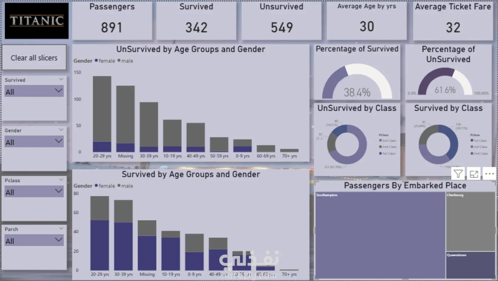 * إنشاء **لوحة تحكم تفاعلية** باستخدام Power BI لتحليل بيانات ركاب Titanic.