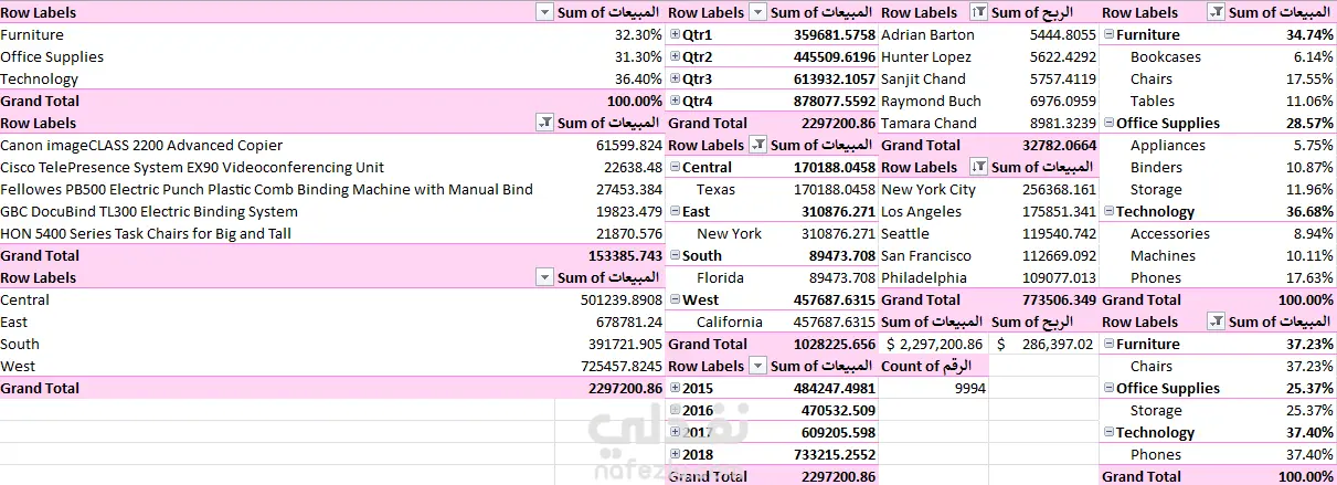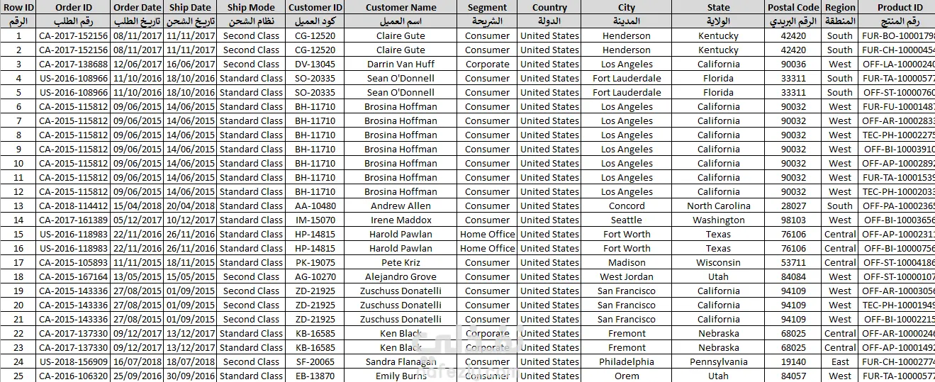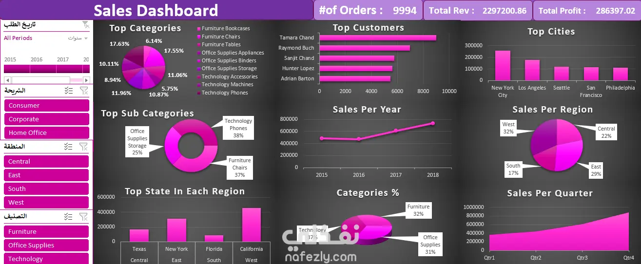 يُقدّم هذا المشروع نموذجًا متكاملًا لتحليل بيانات المبيعات باستخدام لوحة تحكم تفاعلية مصممة باحتراف في Excel. تم تطوير الـ Dashboard لتوفير رؤية شاملة لأداء الشركة عبر عدة محاور، بالاعتماد على أدوات تحليل قوية مثل PivotTables، Slicers، Power Query، Conditional Formatting، وDynamic Charts، بالإضافة إلى دوال مثل SUMIFS، IF، وMATCH لربط البيانات وتصفية النتائج بدقة. تعرض اللوحة مجموعة من المؤشرات الحيوية التي تساعد فرق الإدارة والتسويق على اتخاذ قرارات مبنية على بيانات دقيقة، منها: - إجمالي الإيرادات والأرباح وعدد الطلبات - تحليل المبيعات حسب الفئات (مثل التكنولوجيا، الأثاث، المستلزمات المكتبية) - مقارنة الأداء بين القطاعات المختلفة (شركات، مستهلكين، مكاتب منزلية) - تحديد أفضل العملاء والمدن والولايات من حيث حجم المبيعات - توزيع المبيعات حسب المناطق الجغرافية (شرق، غرب، جنوب، وسط) - تتبع الأداء السنوي والربع سنوي لفهم الاتجاهات والنمو - تحليل الفئات الفرعية الأعلى مبيعًا مثل الهواتف والكراسي والطابعات تم تصميم الواجهة بألوان جذابة وتوزيع بصري واضح يسهل التنقل والتفاعل، مما يتيح للمستخدمين استخلاص رؤى سريعة وفعالة لدعم اتخاذ القرار وتحسين الأداء التجاري.