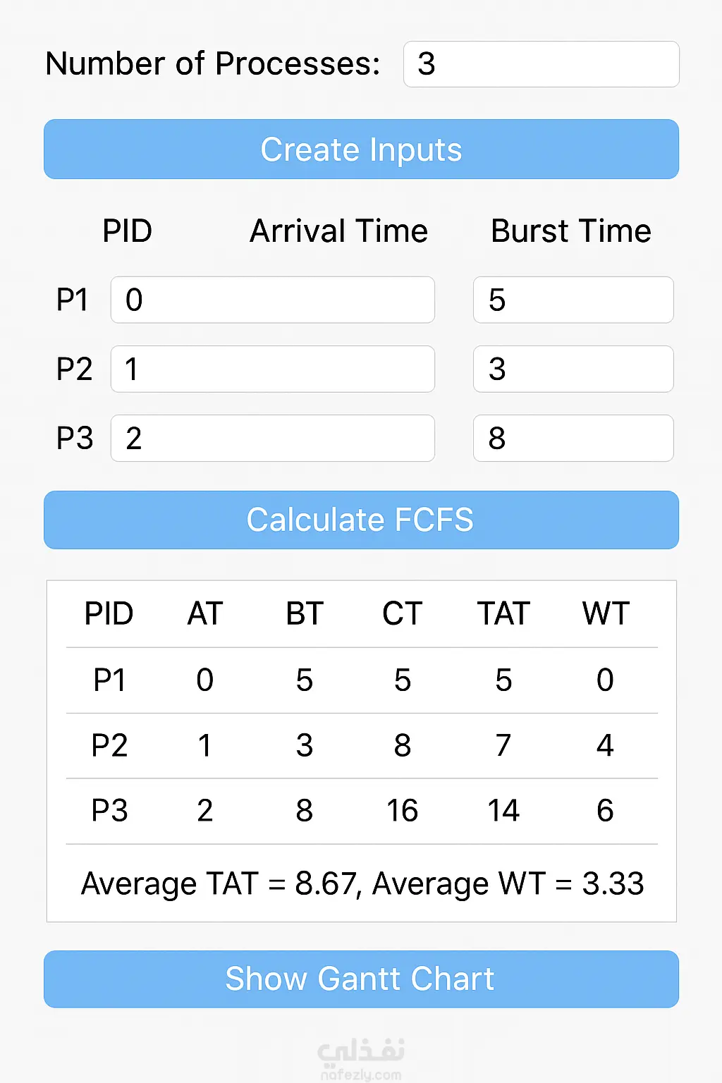 برنامج محاكاة جدولة العمليات - CPU Scheduling Simulator (FCFS)