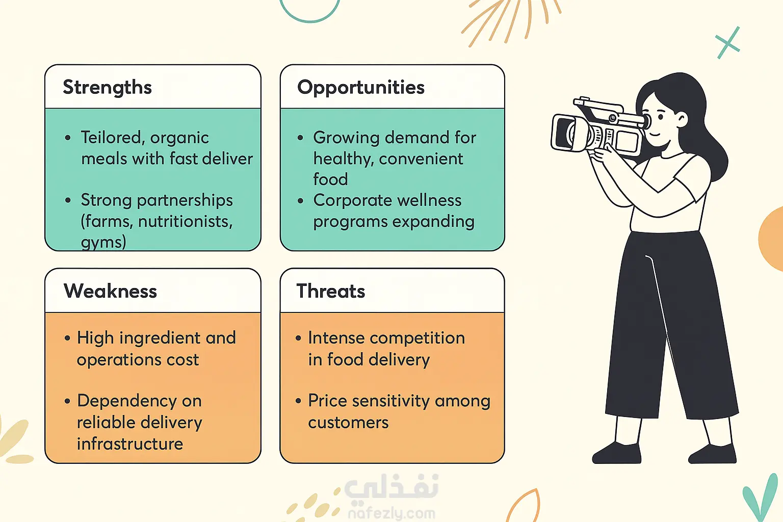 في هذا العمل، قمت بإعداد تحليل SWOT كامل لمشروع توصيل وجبات صحية مخصصة، يركز على تقديم طعام عضوي سريع وذو جودة عالية.
