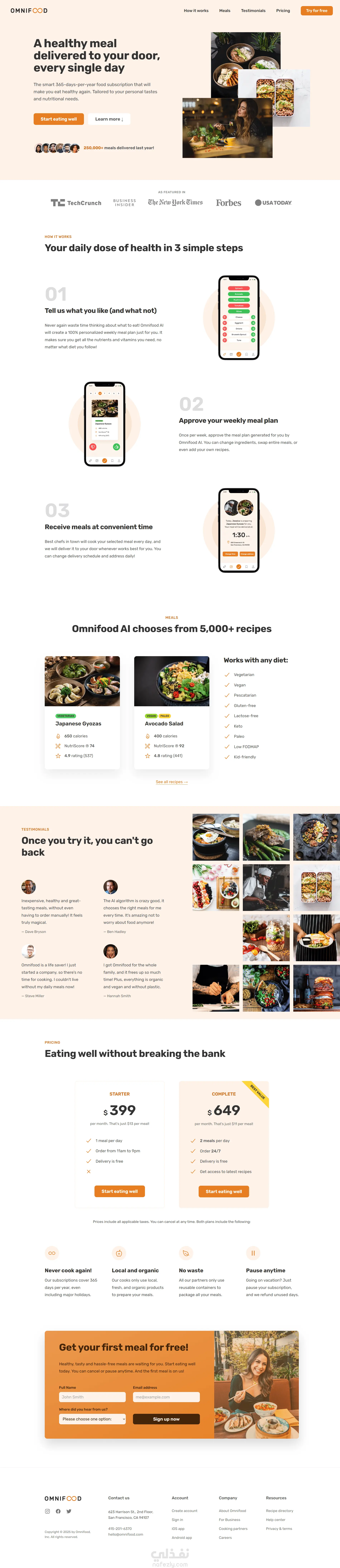 Omnifood – Responsive Landing Page مشروع عملي من كورس Build Responsive Real-World Websites with HTML & CSS، وهو عبارة عن صفحة هبوط (Landing Page) تروّج لخدمة اشتراك للوجبات الصحية. تم تصميم الموقع باستخدام: HTML5 لبناء الهيكل. CSS3 (Flexbox & Grid) لتنسيق وتوزيع العناصر. Responsive Design لضمان التوافق مع جميع الأجهزة (موبايل – تابلت – كمبيوتر). الصفحة تشمل: قسم تعريفي بالخدمة (Hero Section). خطوات عمل النظام. نماذج من الوجبات. آراء العملاء (Testimonials). خطط الأسعار (Pricing Plans). استدعاء لاتخاذ قرار (CTA). الهدف من المشروع: تطبيق عملي لمفاهيم التصميم المتجاوب (Responsive Design) وبناء صفحة ويب عصرية تشبه المواقع الحقيقية للشركات الناشئة.