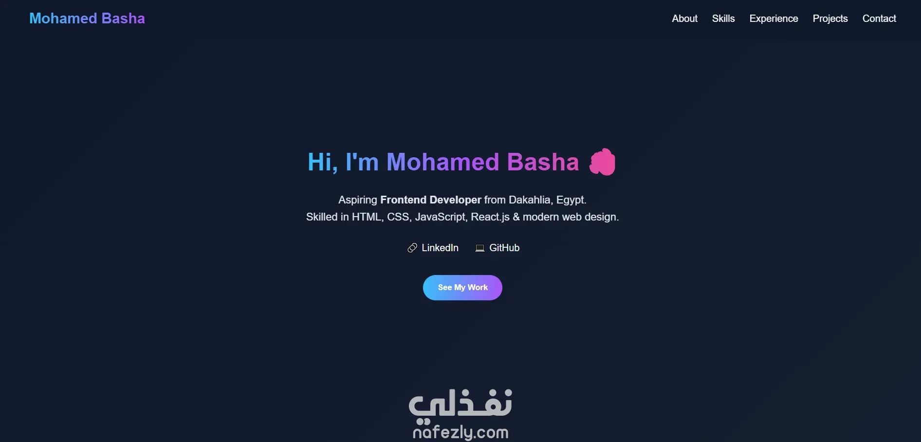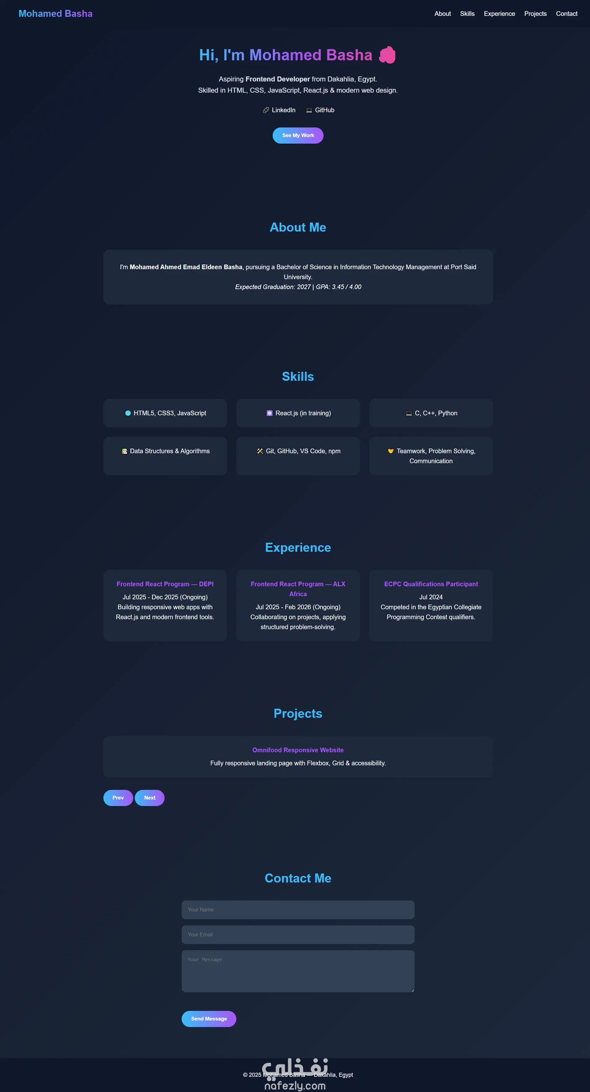 موقع بورتفوليو شخصي – HTML & CSS مشروع موقع بورتفوليو شخصي تم تطويره باستخدام HTML5 وCSS3 فقط. الموقع بيعرض مهاراتي، مشاريعي، وطرق التواصل معي بشكل منظم، عصري، ومتجاوب مع جميع الأجهزة. المميزات: تصميم نظيف واحترافي أقسام: من أنا (About Me)،المهارات(Skills), الخبرة(Experiance), المشاريع (Projects)، والتواصل (Contact) تصميم متجاوب يعمل على الكمبيوتر، التابلت، والموبايل الهدف: ممارسة بناء وتصميم موقع شخصي من الصفر، مع التركيز على HTML السليم وتقنيات CSS الحديثة.