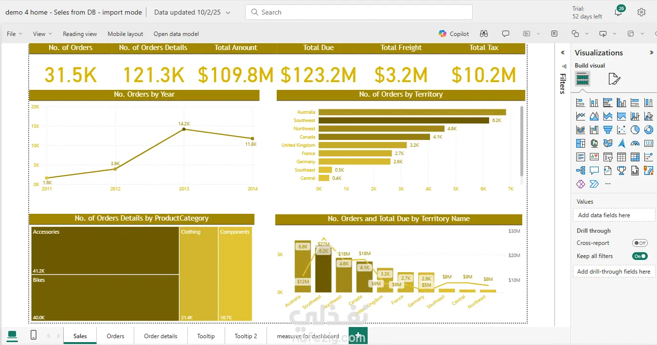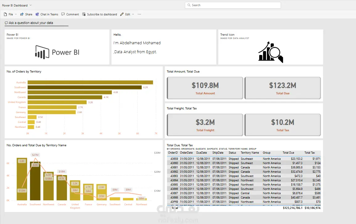 في هذا المشروع قمت بالعمل على قاعدة بيانات AdventureWorks2022 بالكامل باستخدام Power BI:.