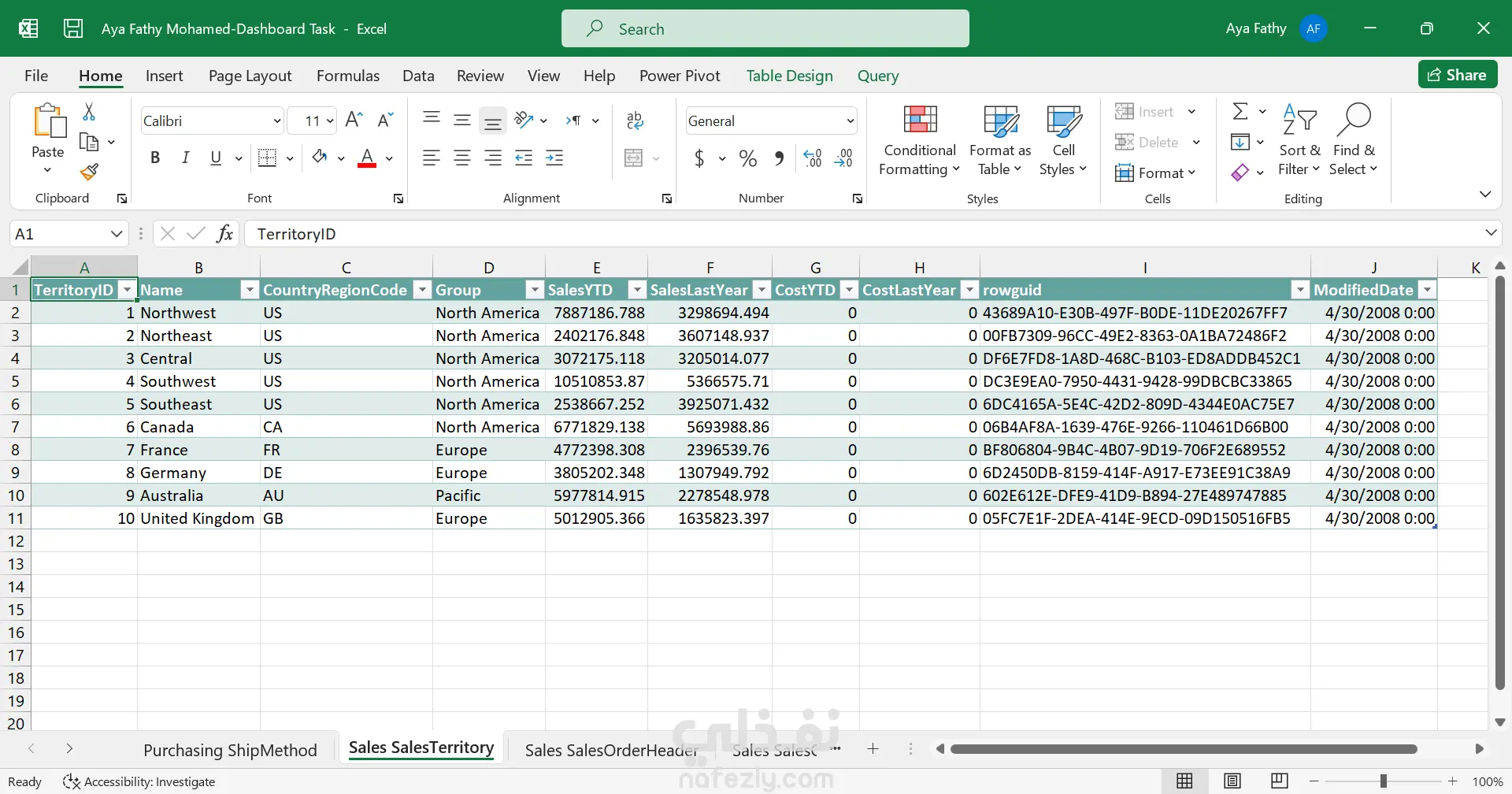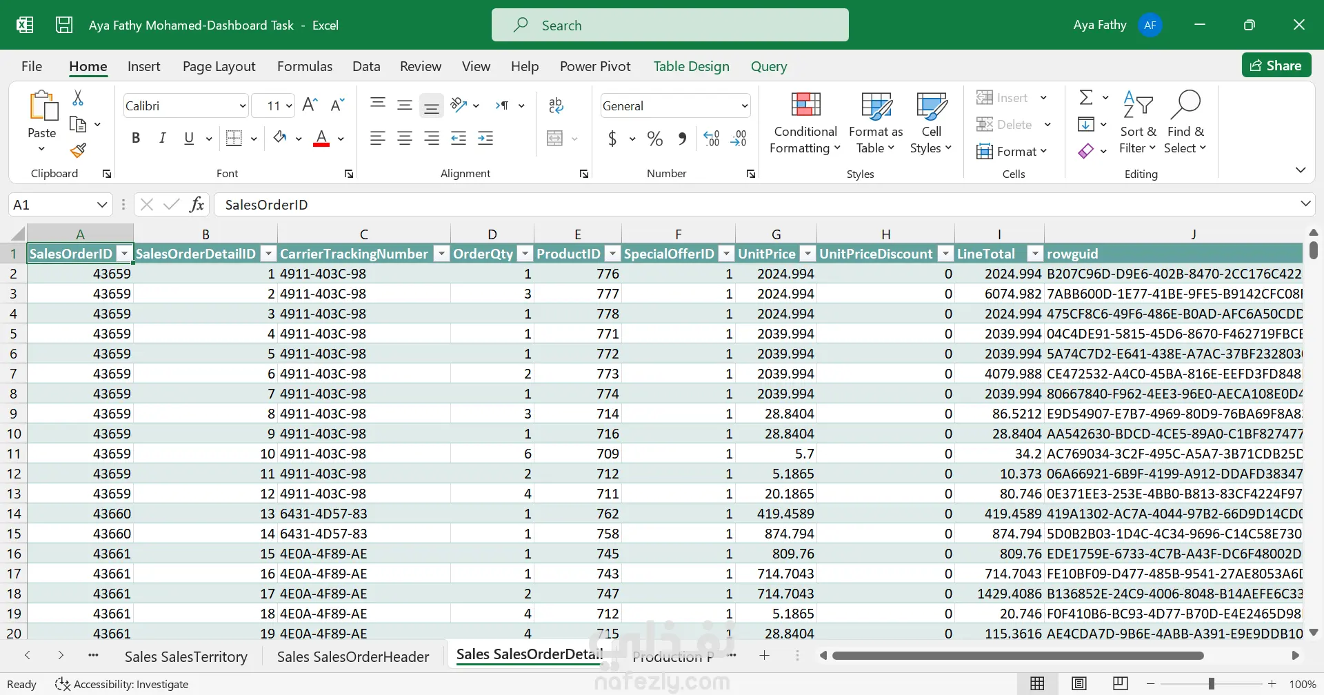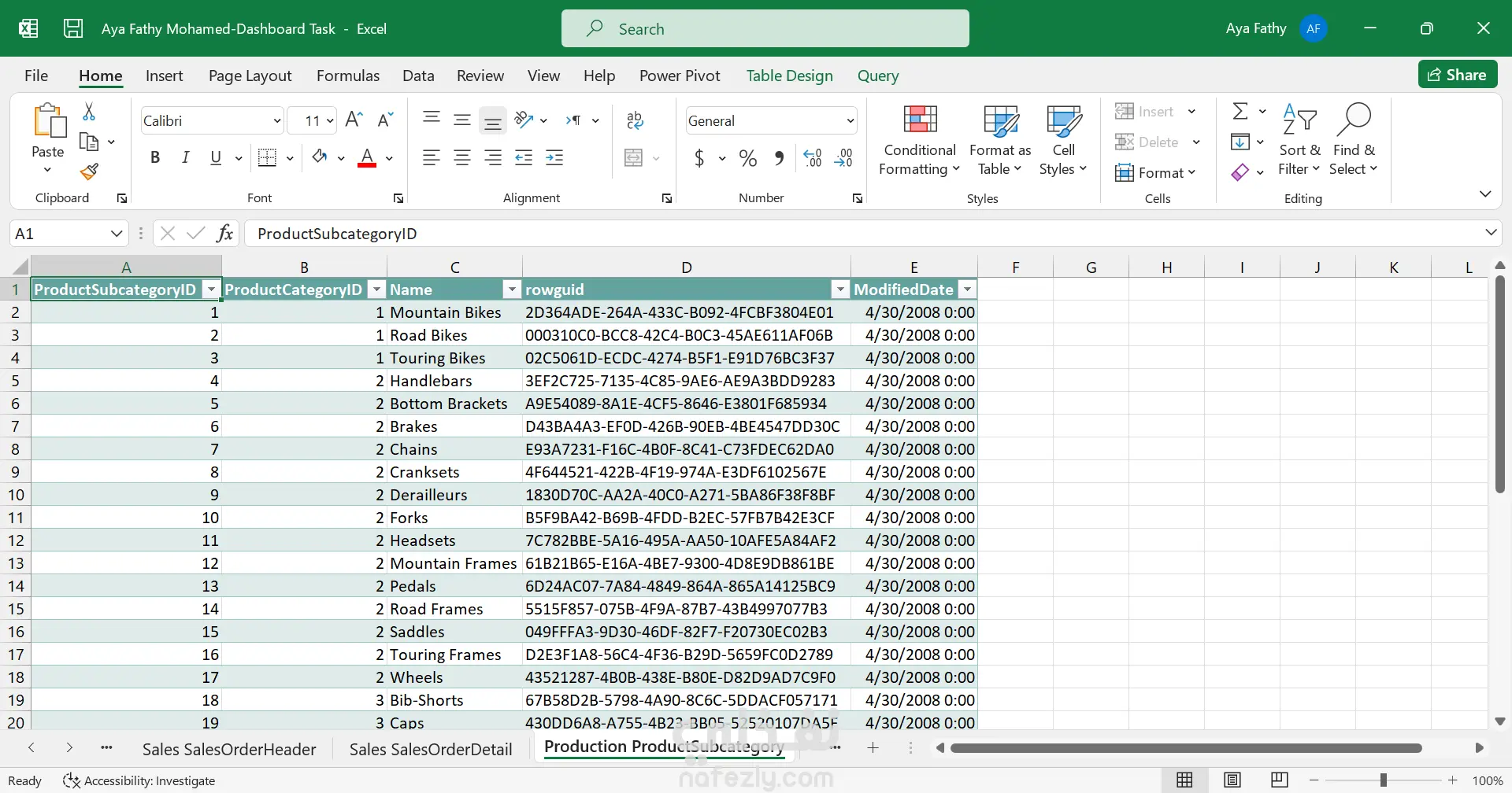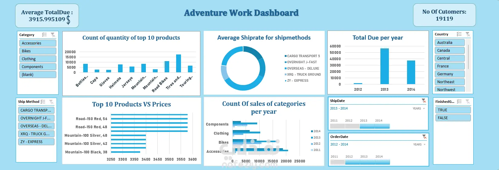 أنشأت داشبورد تفاعلي في Excel لتحليل مبيعات AdventureWorks عبر البلدان والسنوات. استخدمت قاعدة بيانات (AdventureWorks2016.bak) التي تم استيرادها عبر SQL Server إلى Excel، حيث تضمنت 3 جداول رئيسية: المنتجات (13 عمود)، التصنيفات (4 أعمدة)، والتصنيفات الفرعية (5 أعمدة). قمت بتحليل كميات المبيعات والإيرادات باستخدام مخططات دائرية وشريطية وبطاقات تقييم لعرض التوزيع الجغرافي والأداء الزمني.