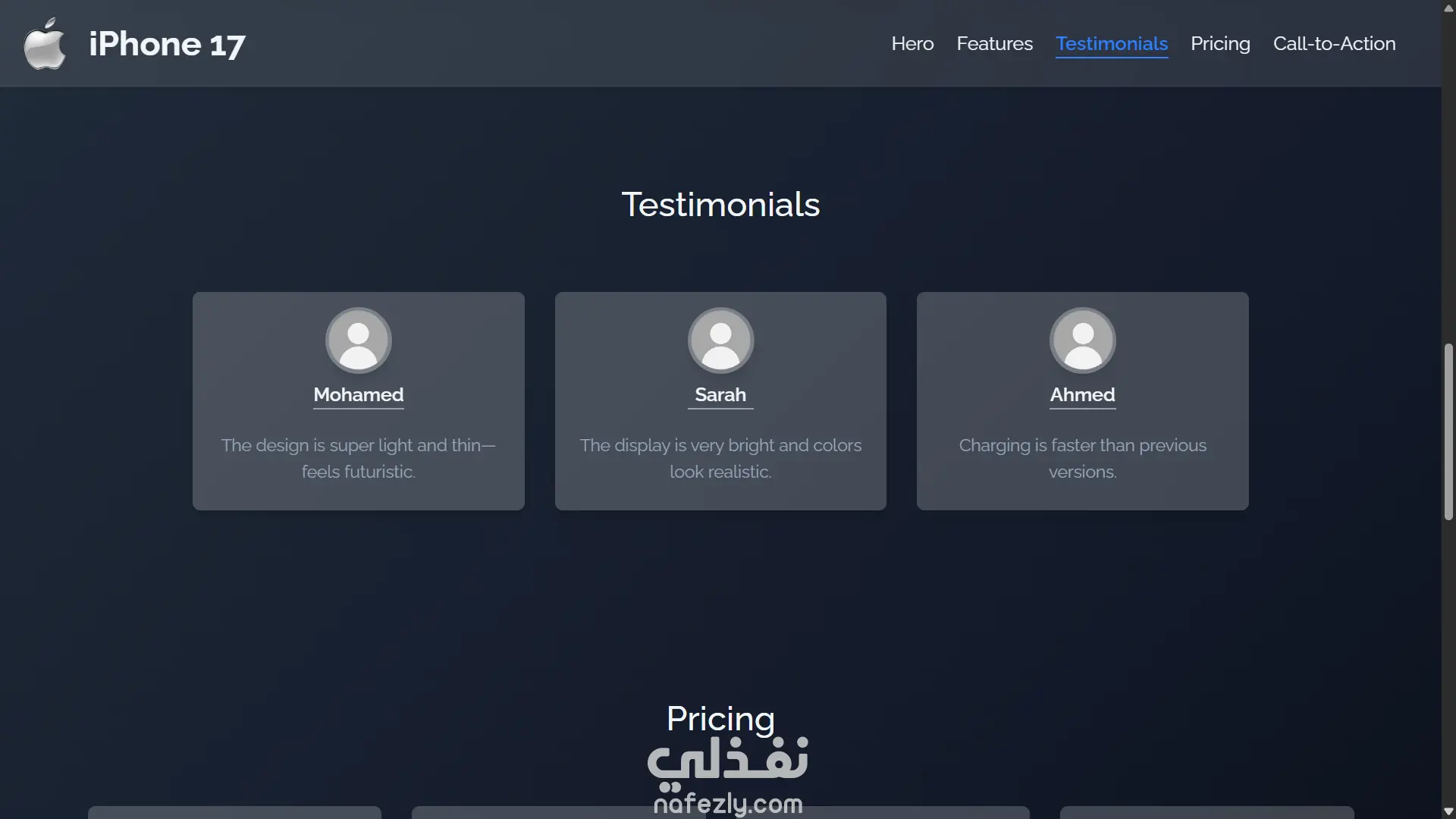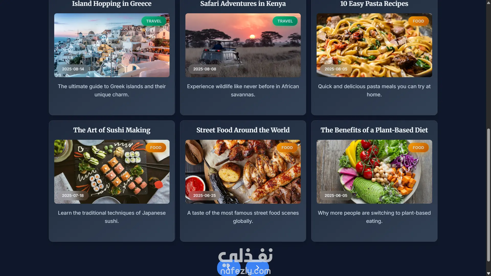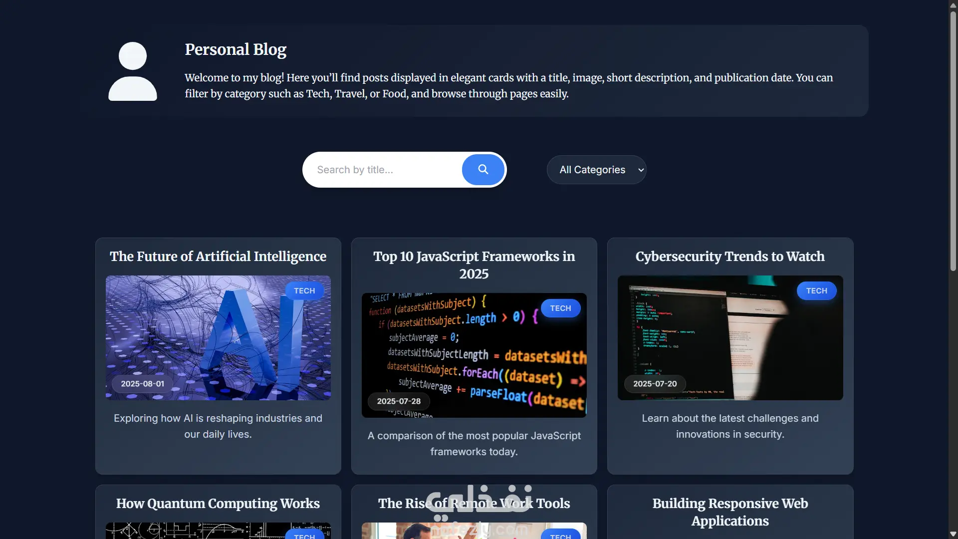 مجموعة من تطبيقات الويب العملية تشمل صفحة هبوط (Landing Page)، ومدوّنة شخصية، ولوحة معلومات للطقس (Weather Dashboard). تبرز هذه المشاريع استخدام تصميم واجهات حديثة بتقنية React وTailwind CSS، إلى جانب دمج واجهات برمجية (API Integration)، وإدارة الحالة (State Management)، وبناء مكوّنات قابلة لإعادة الاستخدام.
