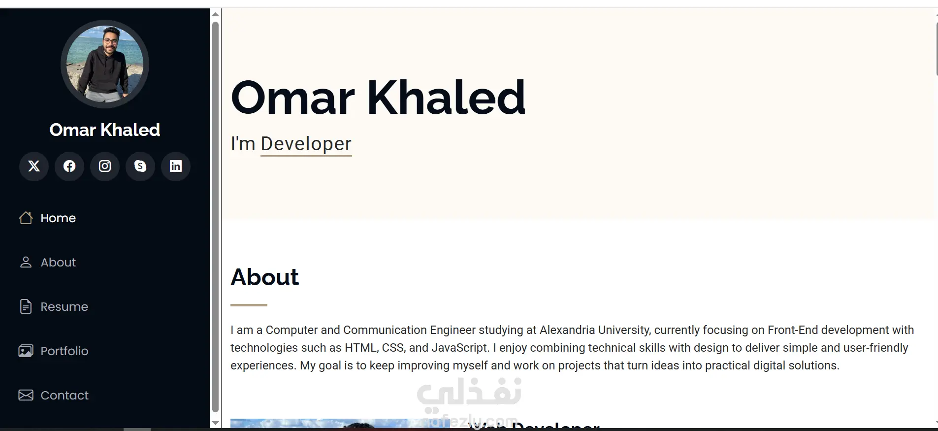 موقع شخصي لعرض مشاريعي ومهاراتي. اتبنى باستخدام HTML, CSS, و JavaScript، مع تصميم متجاوب يشتغل على الموبايل والكمبيوتر. الهدف منه تقديم هوية رقمية منظمة للمطور وإتاحة طرق سهلة للتواصل.