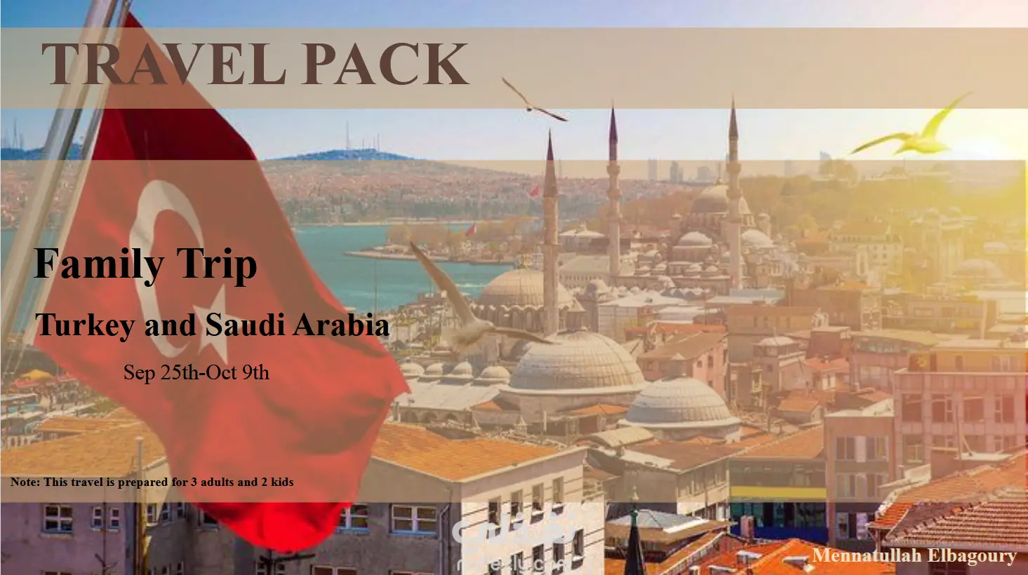 تم إعداد هذه الباقة لتوفير تجربة سفر سلسة ومنظَّمة لرحلة متعددة الوجهات تشمل إسطنبول – تركيا (25 فبراير – 7 مارس 2025) و المملكة العربية السعودية (7 – 11 مارس 2025), لأسرة مكونة من 3 اشخاص بالغين وطفلين محتويات الباقة: البرنامج اليومي: جدول تفصيلي بالرحلة يشمل مواعيد السفر، أماكن الإقامة، والأنشطة. التخطيط اللوجستي: تفاصيل الرحلات الجوية، المواصلات الداخلية، ومعلومات تسجيل الوصول والمغادرة. ملاحظات ثقافية وعملية: معلومات أساسية عن العادات المحلية، أبرز المعالم، ونصائح للسفر. معلومات الطوارئ والتواصل: بيانات منظمة لضمان رحلة آمنة وخالية من التوتر. تهدف هذه الباقة إلى أن تكون مرجعًا عمليًا شاملًا، يجمع بين الدقة في التنظيم والاهتمام بالتفاصيل لتجربة سفر مريحة وممتعة.
