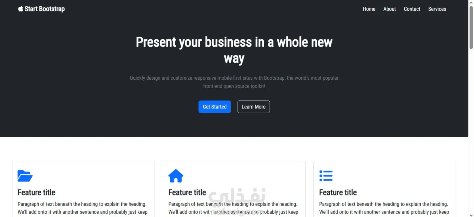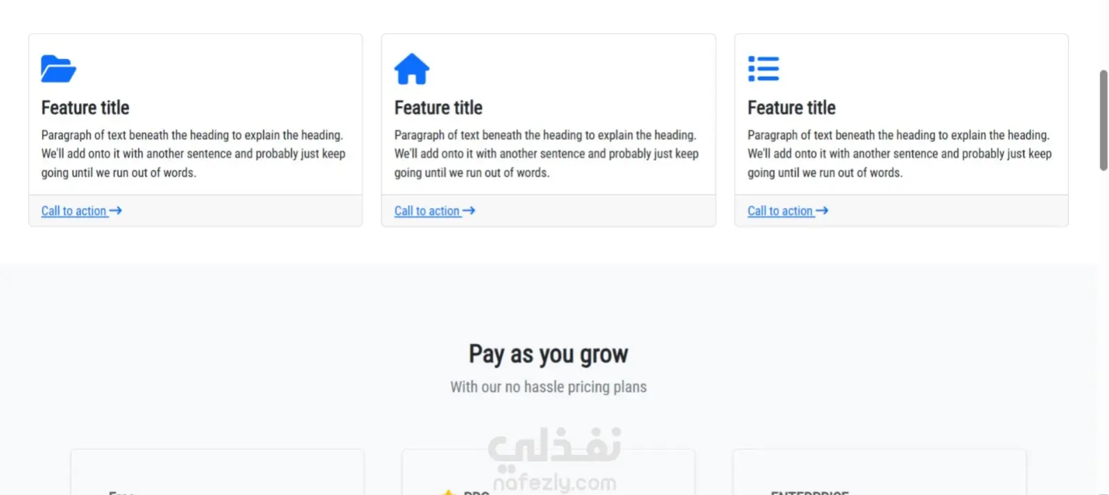 تنظيم المحتوى باستخدام Bootstrap Grid وComponents لعرض الأقسام المختلفة مثل Showcase, Features, Pricing, Testimonials, Contact.