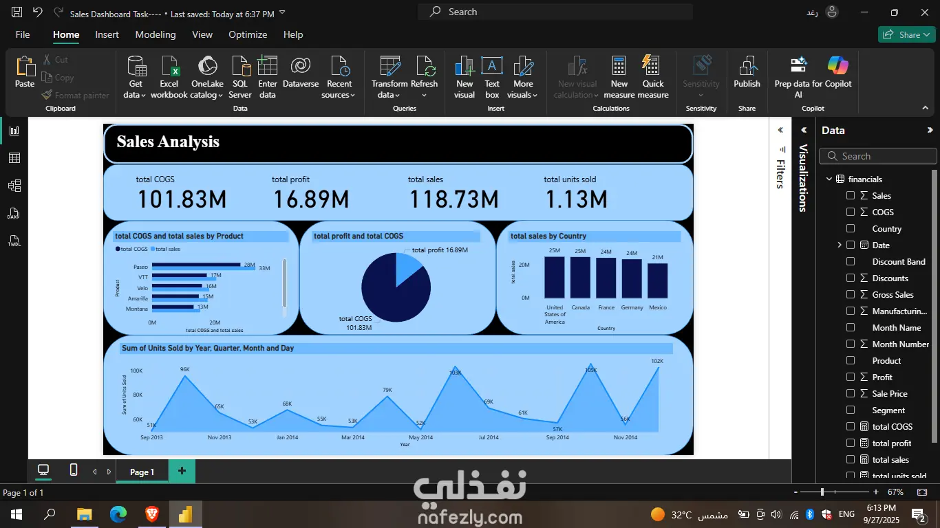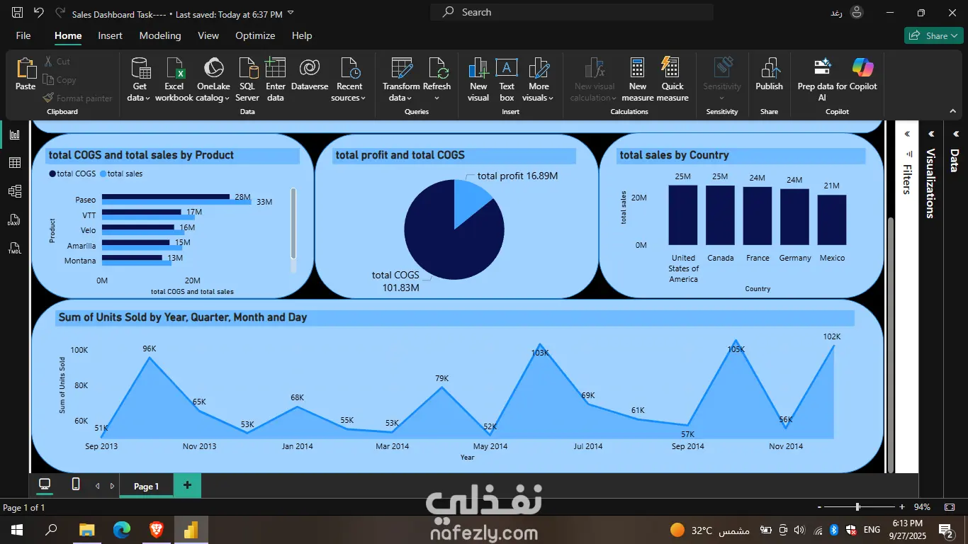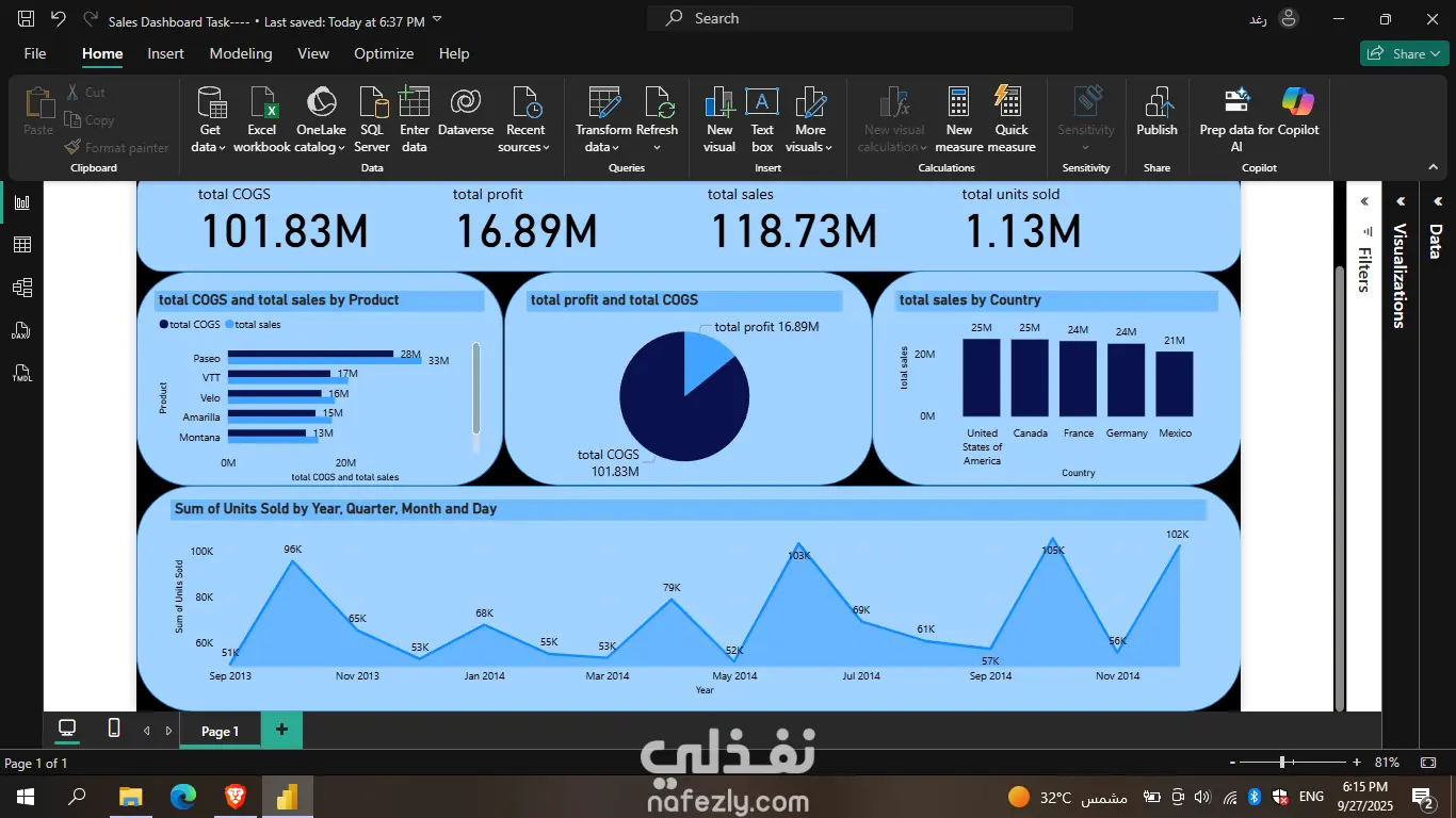 لوحة تحليلية متكاملة تم تطويرها باستخدام أدوات تحليل البيانات ( Power BI)، تهدف إلى تتبع وتحليل أداء المبيعات والتكاليف عبر منتجات وبلدان وفترات زمنية مختلفة. البيانات والمقاييس الرئيسية: إجمالي التكاليف (Total COGS): 101.83 مليون إجمالي الأرباح (Total Profit): 16.89 مليون إجمالي المبيعات (Total Sales): تم تحليلها حسب المنتج والبلد والسنة إجمالي الوحدات المباعة (Sum of Units Sold) عبر السنوات والأشهر التصنيفات والمتغيرات المستخدمة في التحليل: المنتجات (Product): Paseo: 28M (مبيعات) / 33M (تكاليف) VTT: 17M Velo: 16M Amarilla: 15M Montana: 13M البلدان (Country): United States of America Canada France Germany Mexico الزمن: تحليل حسب السنة (2014، 2015)، الربع، الشهر، واليوم المدن: New York وغيرها مقارنة الأداء بين 2014 و2015 التقنيات المستخدمة: Power BI Desktop إعداد البيانات (Data Preparation) مرئيات تفاعلية (Charts, Graphs, Tables) تحليل البيانات متعددة الأبعاد (Multidimensional Analysis) تقارير قابلة للتعمق (Drill-through Reports) مقارنات زمنية (Year-over-Year Comparison) تحليل الربحية والتكاليف (Profitability & COGS Analysis) توفير رؤية شاملة لأداء المبيعات تساعد في: تتبع المبيعات والأرباح عبر المنتج والمنطقة مقارنة الأداء بين السنوات المختلفة تحليل العلاقة بين التكاليف والمبيعات والأرباح تحديد المنتجات والمناطق الأكثر ربحية دعم قرارات التسعير وإدارة المخزون