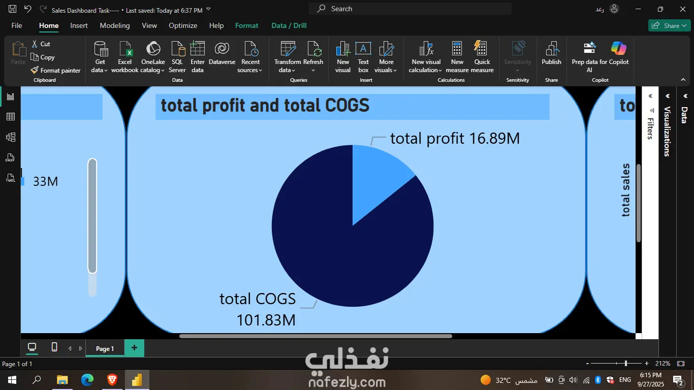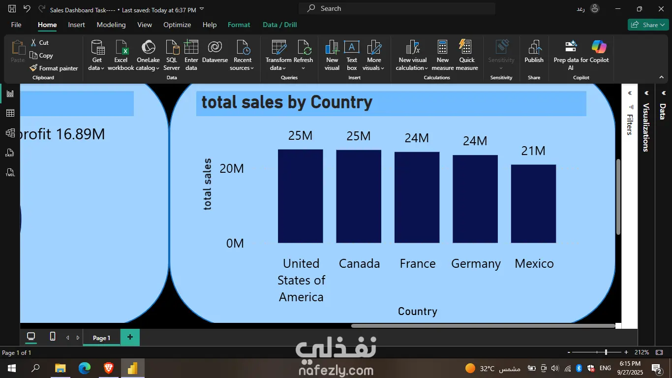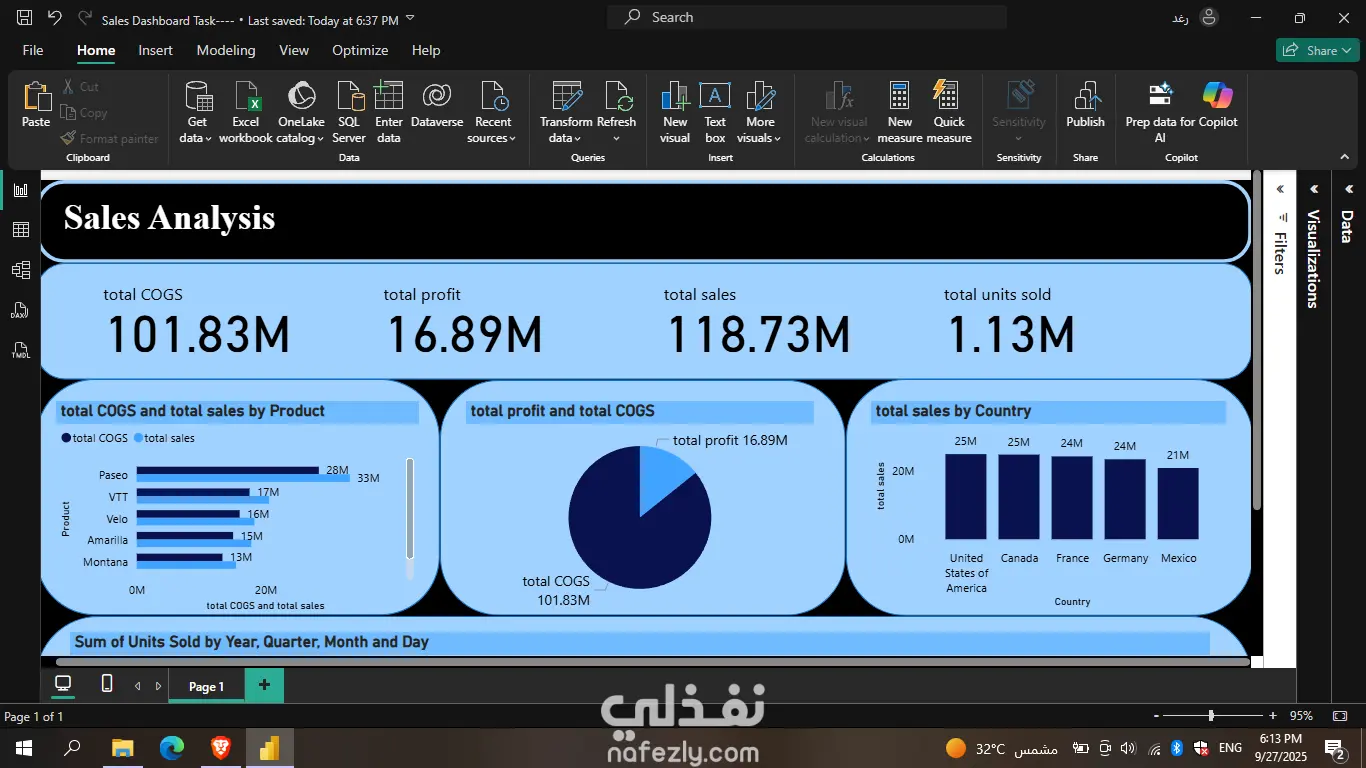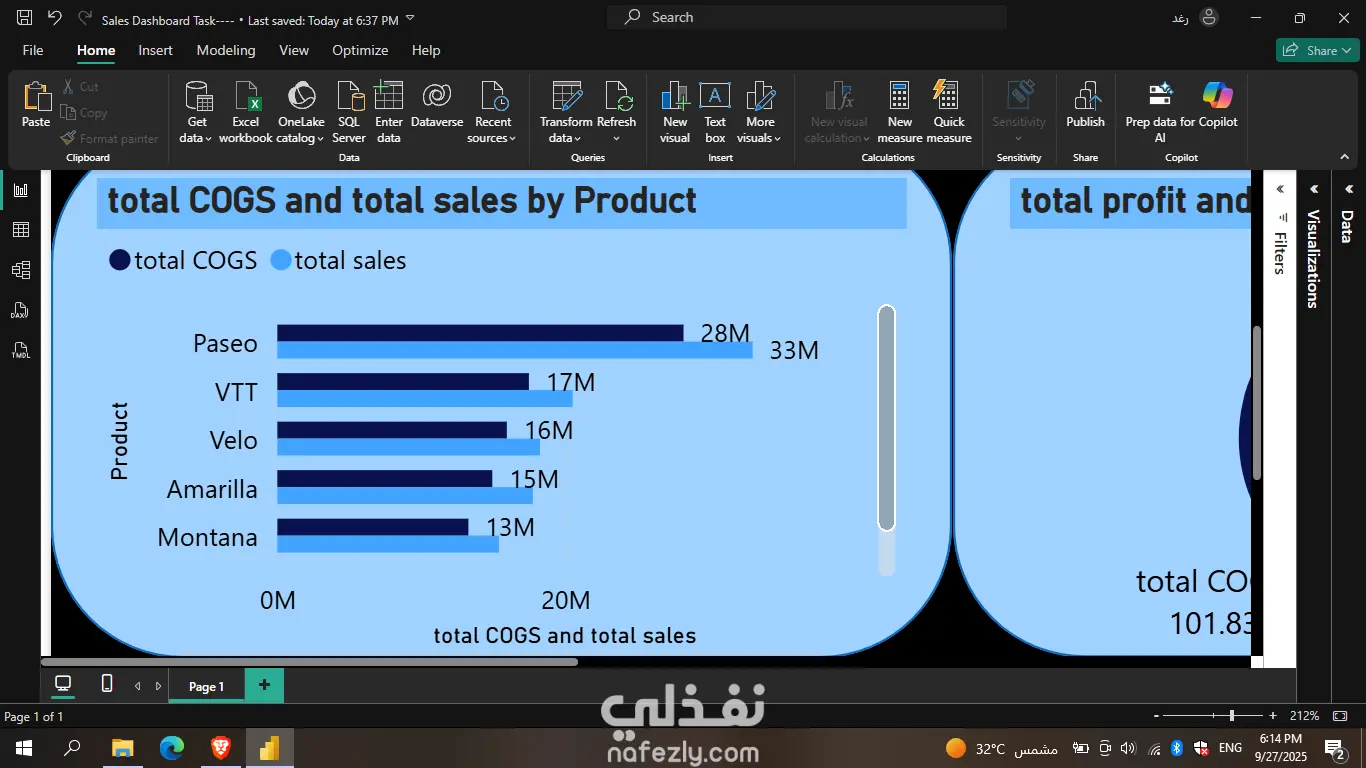 لوحة تحليلية متكاملة تم تطويرها باستخدام أدوات تحليل البيانات ( Power BI)، تهدف إلى تتبع وتحليل أداء المبيعات والتكاليف عبر منتجات وبلدان وفترات زمنية مختلفة. البيانات والمقاييس الرئيسية: إجمالي التكاليف (Total COGS): 101.83 مليون إجمالي الأرباح (Total Profit): 16.89 مليون إجمالي المبيعات (Total Sales): تم تحليلها حسب المنتج والبلد والسنة إجمالي الوحدات المباعة (Sum of Units Sold) عبر السنوات والأشهر التصنيفات والمتغيرات المستخدمة في التحليل: المنتجات (Product): Paseo: 28M (مبيعات) / 33M (تكاليف) VTT: 17M Velo: 16M Amarilla: 15M Montana: 13M البلدان (Country): United States of America Canada France Germany Mexico الزمن: تحليل حسب السنة (2014، 2015)، الربع، الشهر، واليوم المدن: New York وغيرها مقارنة الأداء بين 2014 و2015 التقنيات المستخدمة: Power BI Desktop إعداد البيانات (Data Preparation) مرئيات تفاعلية (Charts, Graphs, Tables) تحليل البيانات متعددة الأبعاد (Multidimensional Analysis) تقارير قابلة للتعمق (Drill-through Reports) مقارنات زمنية (Year-over-Year Comparison) تحليل الربحية والتكاليف (Profitability & COGS Analysis) توفير رؤية شاملة لأداء المبيعات تساعد في: تتبع المبيعات والأرباح عبر المنتج والمنطقة مقارنة الأداء بين السنوات المختلفة تحليل العلاقة بين التكاليف والمبيعات والأرباح تحديد المنتجات والمناطق الأكثر ربحية دعم قرارات التسعير وإدارة المخزون