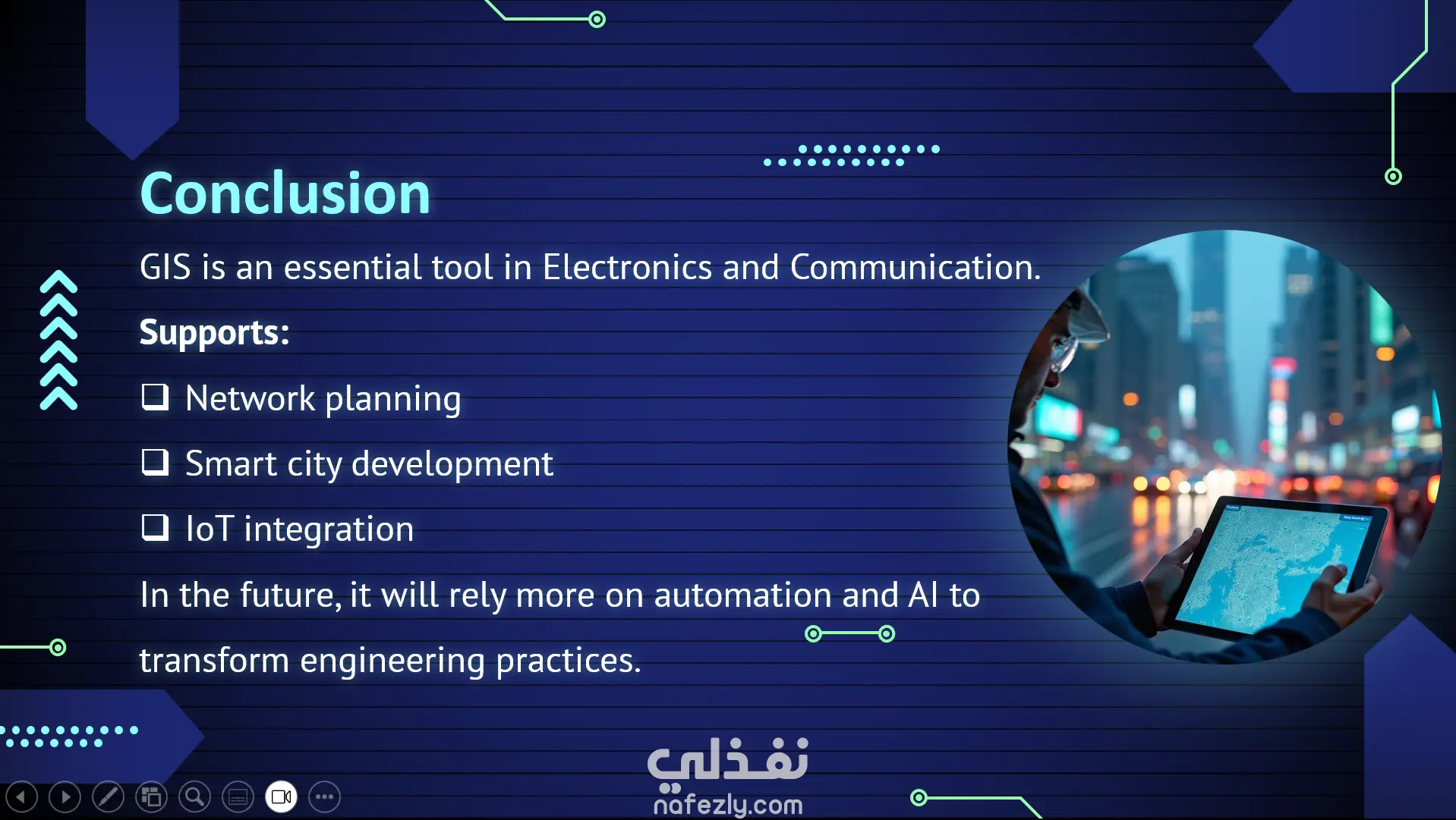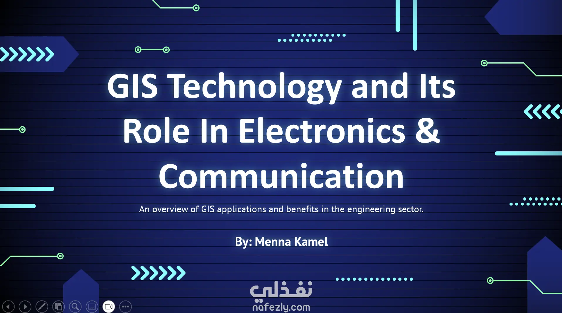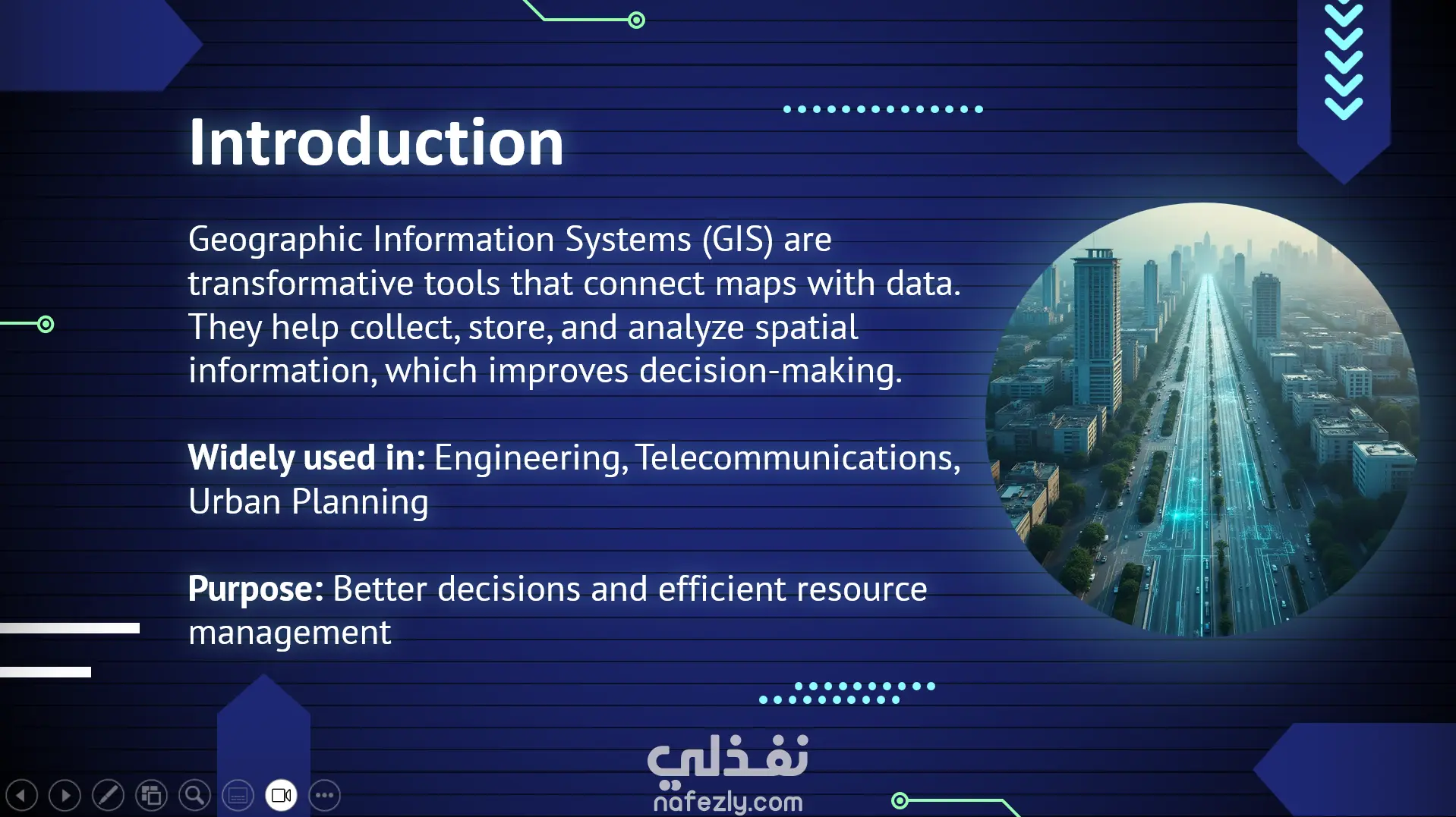 Slide 1: Title GIS Technology Geographic Information System Slide 2: Introduction Definition: A system that integrates digital maps, databases, and analysis tools. Purpose: To collect, store, analyze, and visualize spatial data. Used in: Planning, management, scientific research, and business applications. Slide 3: Components of GIS Hardware: Computers, GPS devices. Software: Programs like ArcGIS, QGIS. Data: Spatial data (maps, satellite images) and attribute data. People: Analysts, developers, decision-makers. Methods: Procedures for analyzing and managing data. Slide 4: Types of Data in GIS Spatial Data: Points: Schools, hospitals. Lines: Roads, rivers. Polygons: City boundaries, farmland. Attribute Data: Descriptive information linked to each element. Slide 5: Functions of GIS Data Capture: Collecting data from surveys, satellites. Data Storage: Organizing spatial and attribute data. Data Analysis: e.g., finding the shortest path or best project location. Visualization: Displaying data on maps and charts. Slide 6: Applications of GIS Urban Planning: City design, transportation planning. Environmental Management: Monitoring environmental changes. Disaster Management: Response to natural disasters. Agriculture: Smart farming, irrigation planning. Business: Store location analysis, market research. Slide 7: Benefits of GIS Better decision-making. Linking spatial and descriptive data. Saving time and costs. Supporting scientific research. Slide 8: Challenges of GIS High cost of hardware and software. Complexity of data collection and processing. Need for trained specialists. Continuous data updating required. Slide 9: Future of GIS Integration with Artificial Intelligence (AI) and Big Data. Use in autonomous vehicles. Enhanced real-time monitoring of events. Slide 10: Conclusion GIS is a powerful tool for connecting spatial and attribute information. It supports problem-solving in planning, management, and research. The future brings more opportunities with emerging technologies.