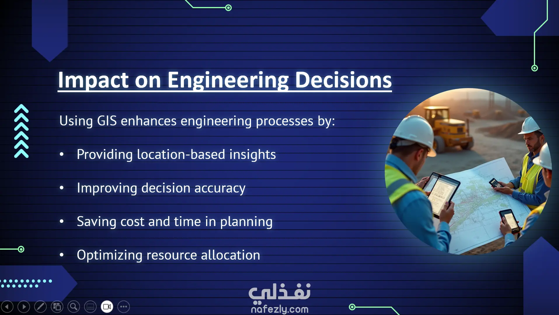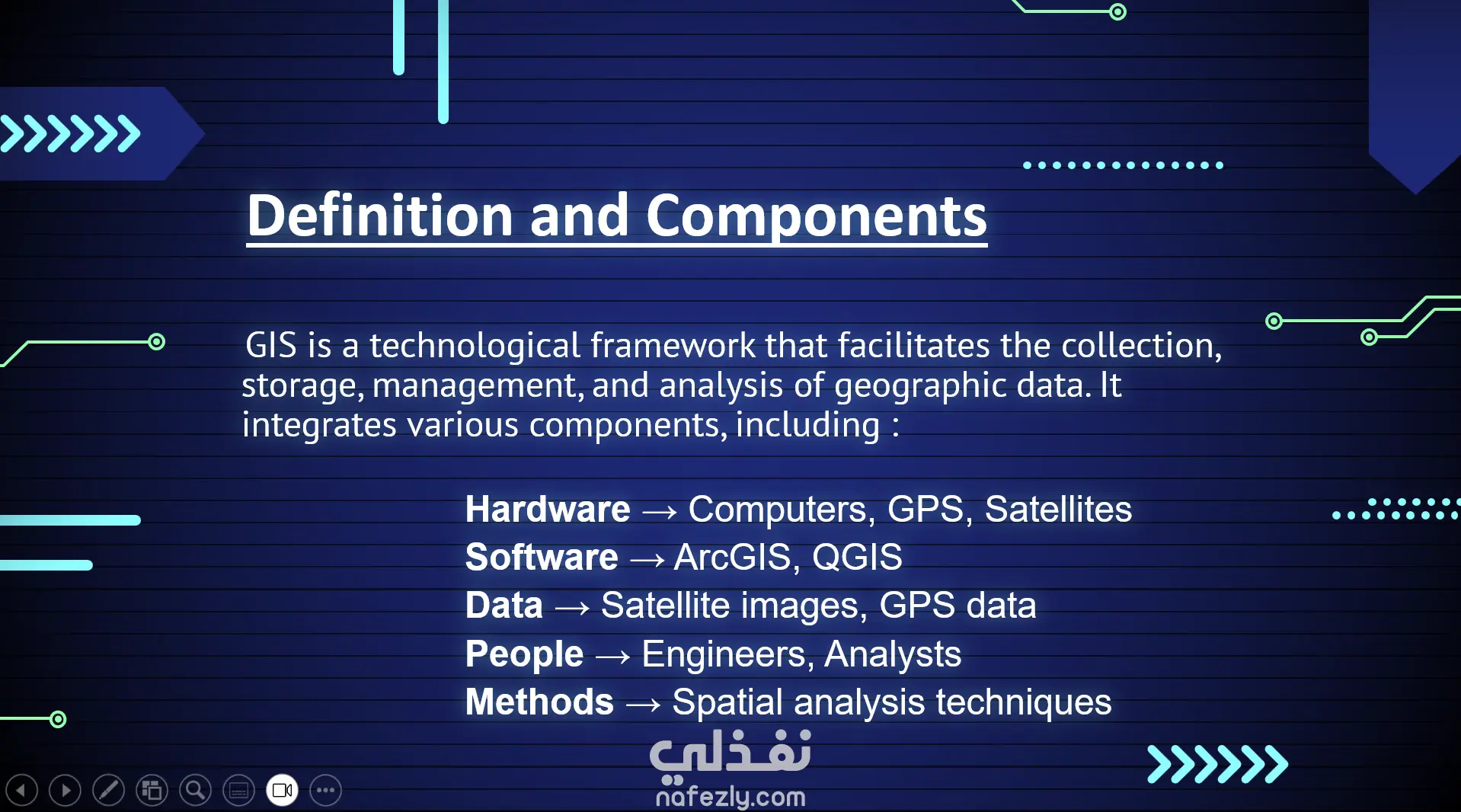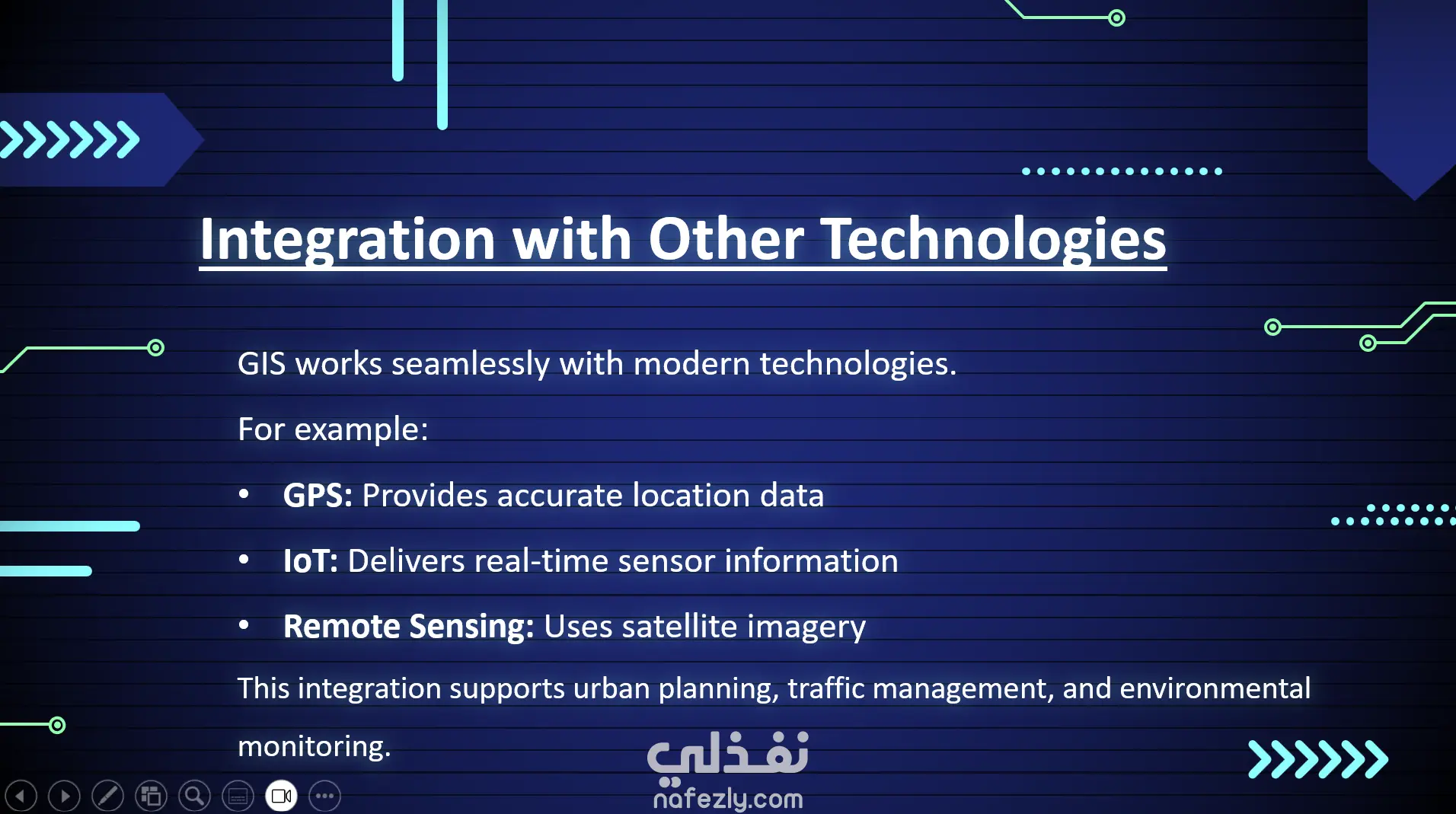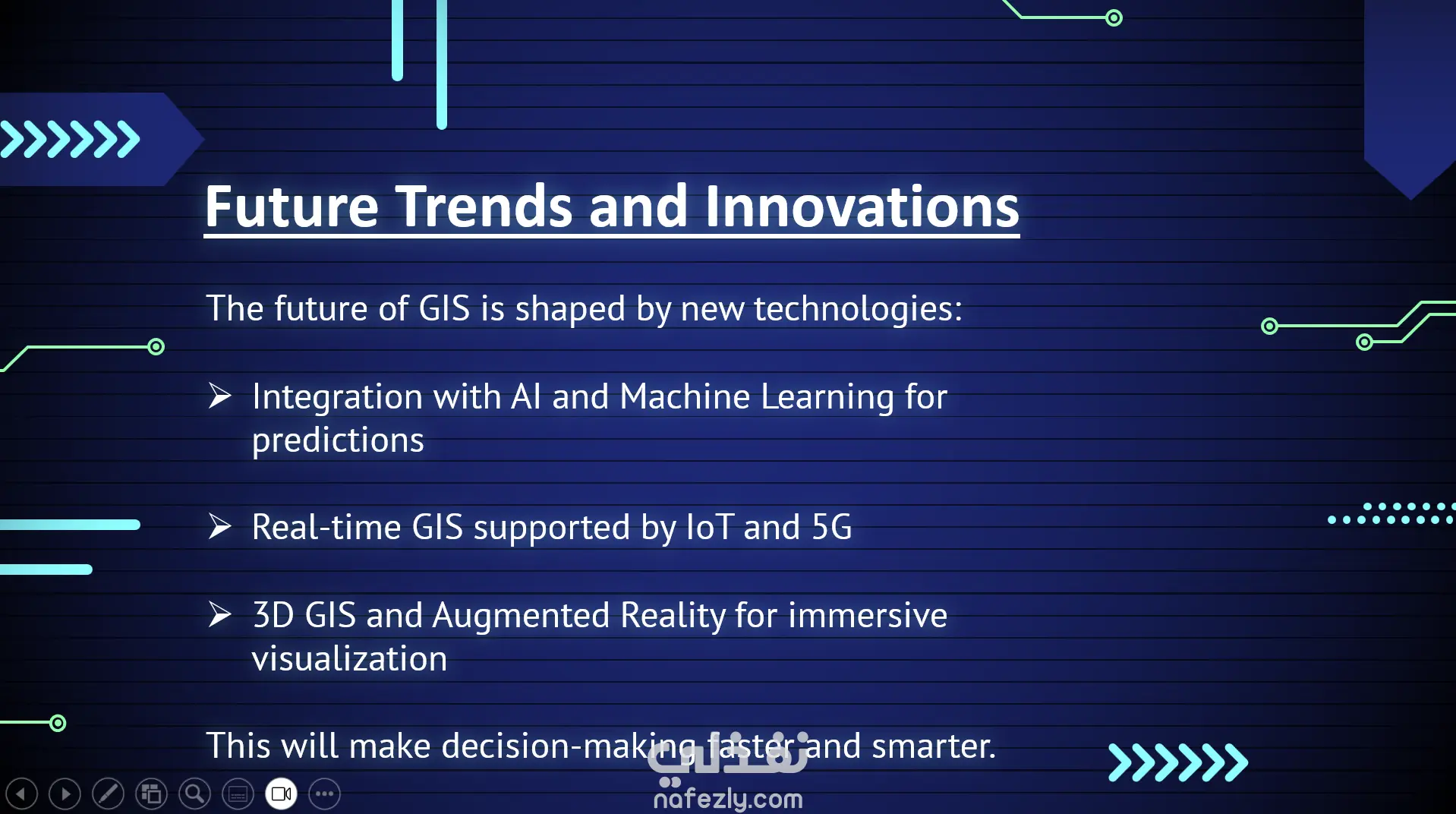 Slide 1: Title GIS Technology Geographic Information System Slide 2: Introduction Definition: A system that integrates digital maps, databases, and analysis tools. Purpose: To collect, store, analyze, and visualize spatial data. Used in: Planning, management, scientific research, and business applications. Slide 3: Components of GIS Hardware: Computers, GPS devices. Software: Programs like ArcGIS, QGIS. Data: Spatial data (maps, satellite images) and attribute data. People: Analysts, developers, decision-makers. Methods: Procedures for analyzing and managing data. Slide 4: Types of Data in GIS Spatial Data: Points: Schools, hospitals. Lines: Roads, rivers. Polygons: City boundaries, farmland. Attribute Data: Descriptive information linked to each element. Slide 5: Functions of GIS Data Capture: Collecting data from surveys, satellites. Data Storage: Organizing spatial and attribute data. Data Analysis: e.g., finding the shortest path or best project location. Visualization: Displaying data on maps and charts. Slide 6: Applications of GIS Urban Planning: City design, transportation planning. Environmental Management: Monitoring environmental changes. Disaster Management: Response to natural disasters. Agriculture: Smart farming, irrigation planning. Business: Store location analysis, market research. Slide 7: Benefits of GIS Better decision-making. Linking spatial and descriptive data. Saving time and costs. Supporting scientific research. Slide 8: Challenges of GIS High cost of hardware and software. Complexity of data collection and processing. Need for trained specialists. Continuous data updating required. Slide 9: Future of GIS Integration with Artificial Intelligence (AI) and Big Data. Use in autonomous vehicles. Enhanced real-time monitoring of events. Slide 10: Conclusion GIS is a powerful tool for connecting spatial and attribute information. It supports problem-solving in planning, management, and research. The future brings more opportunities with emerging technologies.