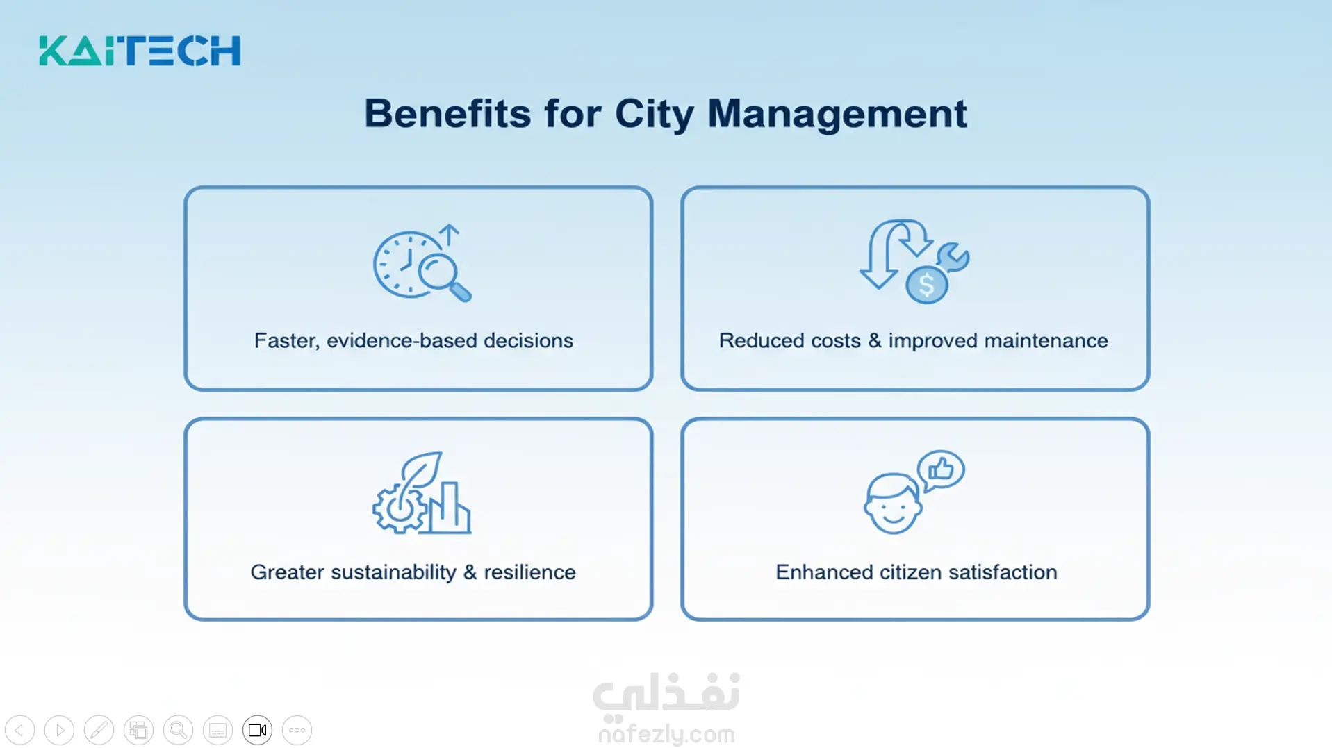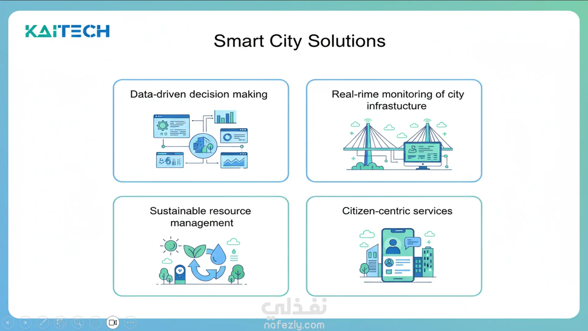 Slide 1: Title Smart City Shaping the Future of Urban Living Your Name / Date / Course Slide 2: Introduction Definition: A Smart City uses digital technologies, IoT, and data-driven solutions to improve urban life. Goal: Enhance efficiency, sustainability, and quality of life. Examples: Smart traffic systems, e-governance, renewable energy integration. Slide 3: Key Features of a Smart City Smart Infrastructure Efficient Energy Management Smart Transportation Digital Governance Waste & Water Management Public Safety & Security Slide 4: Technologies Used Internet of Things (IoT): Smart sensors & devices. Artificial Intelligence (AI): Predictive analytics, automation. Big Data: Real-time data collection and analysis. Cloud Computing: Data storage and services. 5G Networks: High-speed communication. Slide 5: Smart Transportation Intelligent traffic lights. Real-time public transport tracking. Electric & autonomous vehicles. Smart parking systems. Slide 6: Smart Energy & Environment Smart grids for efficient energy distribution. Renewable energy sources (solar, wind). Energy-efficient buildings. Air quality monitoring. Slide 7: Smart Governance E-Government services. Online portals for public participation. Transparent and efficient administration. Slide 8: Benefits of Smart Cities Improved quality of life. Reduced traffic congestion. Energy savings and sustainability. Safer communities. Better urban planning. Slide 9: Challenges High implementation costs. Data privacy and security issues. Digital divide (not all citizens have equal access). Integration with old infrastructure. Slide 10: Case Studies Singapore: Smart mobility & e-governance. Dubai: Smart policing and infrastructure. Barcelona: Smart lighting & energy management. Slide 11: Future of Smart Cities AI-driven city management. More reliance on renewable energy. Fully automated transportation systems. Enhanced citizen engagement. Slide 12: Conclusion Smart cities represent the future of urban development. Aim to create sustainable, efficient, and livable spaces. Technology + Innovation = Better quality of life.