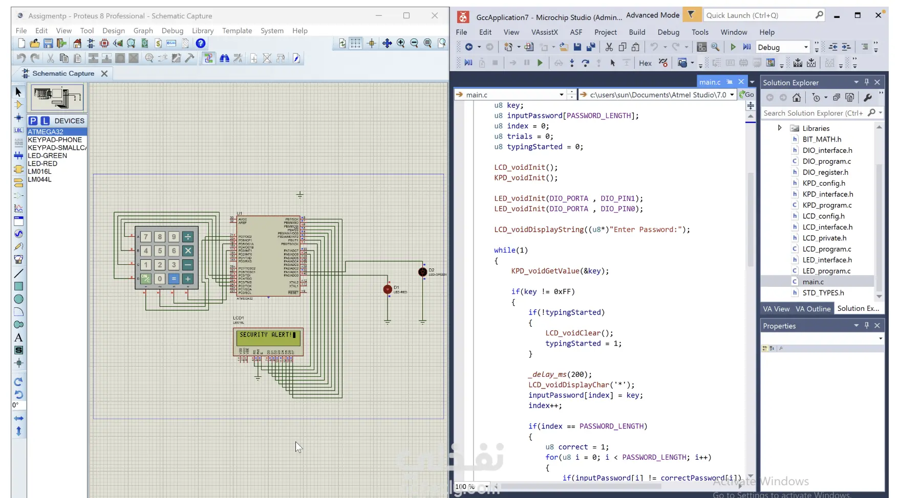 تم تصميم وتنفيذ نظام دخول آمن باستخدام ميكروكنترولر AVR، حيث يقوم المستخدم بإدخال كلمة المرور عبر لوحة مفاتيح (Keypad). يتم مقارنة المدخلات مع كلمة مرور مخزنة مسبقًا: •في حال إدخال كلمة المرور الصحيحة : يظهر على شاشة LCD رسالة ترحيب ويتم تشغيل الـLED الأخضر لمدة 5 ثوانٍ لمحاكاة فتح الباب. •في حال إدخال كلمة مرور خاطئة : يمنح النظام المستخدم 3 محاولات فقط. •عند تجاوز عدد المحاولات المسموح به: يتم تفعيل الـLED الأحمر ويظهر تحذير أمني على شاشة الـLCD. يوضح هذا المشروع كيفية الدمج بين البرمجة بلغة C و تطبيقات الأنظمة المدمجة مع التعامل مع المكونات الإلكترونية (LCD, Keypad, LEDs) لبناء نظام أمني مبسط وعملي.
