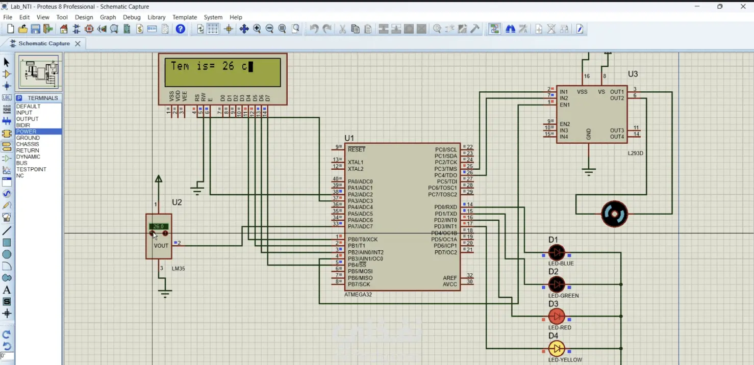 المشروع عبارة عن نظام تحكم ذكي في درجة الحرارة يعتمد على متحكم دقيق (ATmega32) لقراءة درجة الحرارة من حساس (ADC)، ثم يعرض القيمة المقاسة على شاشة LCD. في حالة ارتفاع درجة الحرارة عن مستويات محددة، يقوم النظام بتشغيل المروحة بشكل أوتوماتيكي والتحكم في سرعتها باستخدام تقنية PWM، بالإضافة إلى إضاءة لمبات LED كمؤشرات لحالة النظام.