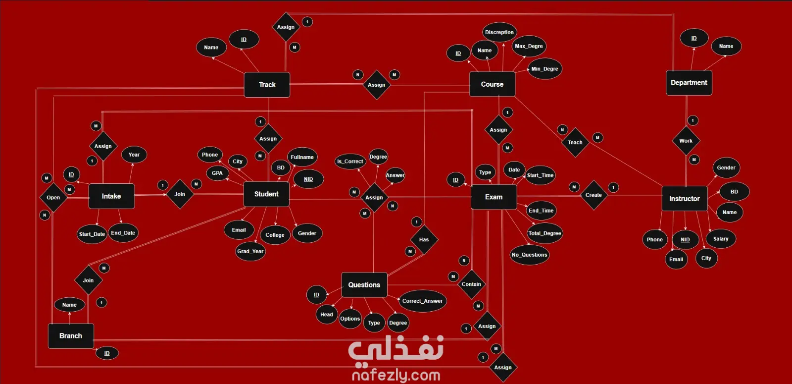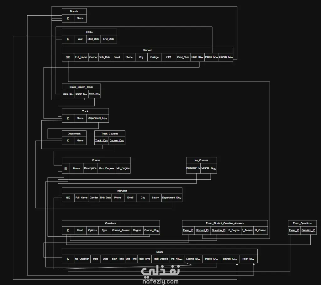وصف مشروع نظام إدارة الامتحانات والتعليم (Education and Examination Management System) هذا المشروع يمثل نظام متكامل لإدارة العمليات الأكاديمية والامتحانات في بيئة تعليمية، مصمم بتركيز على الكفاءة والمرونة في تقييم الطلاب وإدارة المحتوى الدراسي. 1. تصميم قاعدة البيانات والهيكلة (Database Design and Structure) قمت بتصميم قاعدة بيانات قوية وفعالة باستخدام منهجيات نمذجة البيانات المتقدمة. نموذج الكيان والعلاقة (ERD): تصميم نموذج تفصيلي يحدد جميع الكيانات الرئيسية (مثل Student, Instructor, Course, Exam, Questions, Branch, Department, Track, Intake) والعلاقات المعقدة بينها، مما يضمن سلامة البيانات وقابليتها للتوسع. هيكلة Schema (DDL): بناء مخطط قاعدة بيانات (Schema) يترجم نموذج ERD إلى جداول فعلية، مع تحديد المفاتيح الأساسية والخارجية (Primary and Foreign Keys) وضمان العلاقات المنطقية بين الجداول مثل: ربط الطلاب بالـ Intake والـ Branch. إدارة علاقة الأسئلة بالامتحانات (Exam_Questions). تتبع إجابات الطلاب ودرجاتهم (Exam_Student_Answers). 2. تطوير الإجراءات المخزنة (Stored Procedures Development) تم تطوير مجموعة شاملة من الإجراءات المخزنة (Stored Procedures) لإدارة العمليات اليومية بكفاءة عالية وأمان، وتشمل: إدارة البيانات الأساسية (CRUD Operations): إجراءات لإضافة، تعديل، وحذف الكيانات الأساسية في النظام (Branch, Department, Track, Student, Instructor, Course). إدارة الامتحانات: إنشاء امتحانات جديدة (Create Exam). إضافة أسئلة للامتحان عشوائيًا أو يدويًا (Add Question To Exam). عرض الامتحان للطالب (View Exam To Student). عملية تقديم الإجابات وتقييمها (Submission and Grading): Submit Student Answer: إجراء متقدم يتيح للطالب إرسال إجابته. هذا الإجراء يتضمن منطقًا لـ: التفريق بين أنواع الأسئلة: معالجة الإجابات لأسئلة الاختيار من متعدد (Multiple choice) وأسئلة النص (Text). التقييم الذكي للنص: استخدام دالة Levenshtein Similarity لتقييم إجابات الأسئلة النصية، حيث يتم اعتبار الإجابة صحيحة إذا كانت نسبة التشابه مع الإجابة الصحيحة تساوي أو تزيد عن 80% (0.8). عرض ومقارنة الإجابات (Show Answer & Compare Submitted Answer With Correct Answer). احتساب النتائج: الحصول على النتيجة النهائية للطالب في الامتحان (Get Final Result For Student In Exam). الحصول على إجمالي نتائج الطلاب للمدرب في مقرر معين (Get Final Result For Instructor In His Course). 3. المهارات التقنية المستخدمة قواعد البيانات: SQL Server / أي نظام يدعم T-SQL. نمذجة البيانات: Entity-Relationship Modeling. البرمجة: كتابة إجراءات مخزنة معقدة تتضمن منطق تحكم (IF EXISTS, CASE statements) ومعالجة الأخطاء (TRY...CATCH). الخوارزميات: استخدام دالة Levenshtein Similarity للمقارنة النصية الدقيقة.