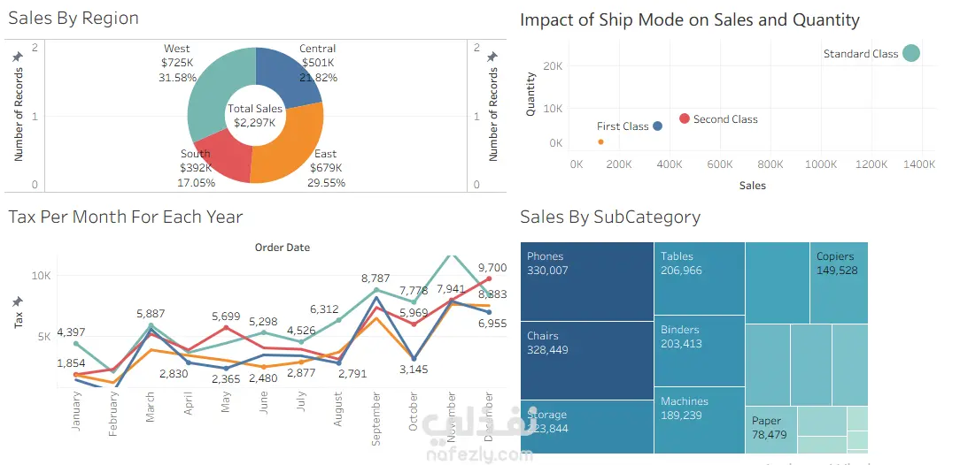 - صممت مخطط Donut Chart يعرض توزيع المبيعات حسب المناطق: West - East - Central - South مع إظهار القيمة والنسبة لكل منطقة.