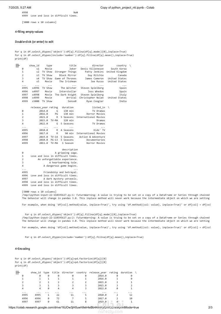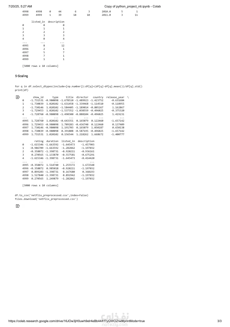 تنظيف بيانات عن الموقع الشهير Netflix و إيصالها للجزء الخاص ب Machine learning بإستخدام Python حيث تم - تحديد الصفوف المكررة - تم ازالة الصفوف المتكررة - تم تعويض القيم الرقمية المفقودة بإستخدام المتوسط الحسابي و الوسيط - تم تعويض القيم النصية المفقودة بإستخدام المنوال - تم عمل الترميز Encoding لتحويل البيانات النصية لأرقام - تم عمل المقياس Scaling لتحويل القيم الرقمية لمستوي واحد