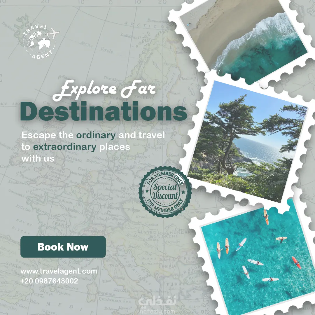 تصميم إعلان دعائي لشركة سياحية يهدف إلى إبراز روح المغامرة والاسترخاء في آن واحد.