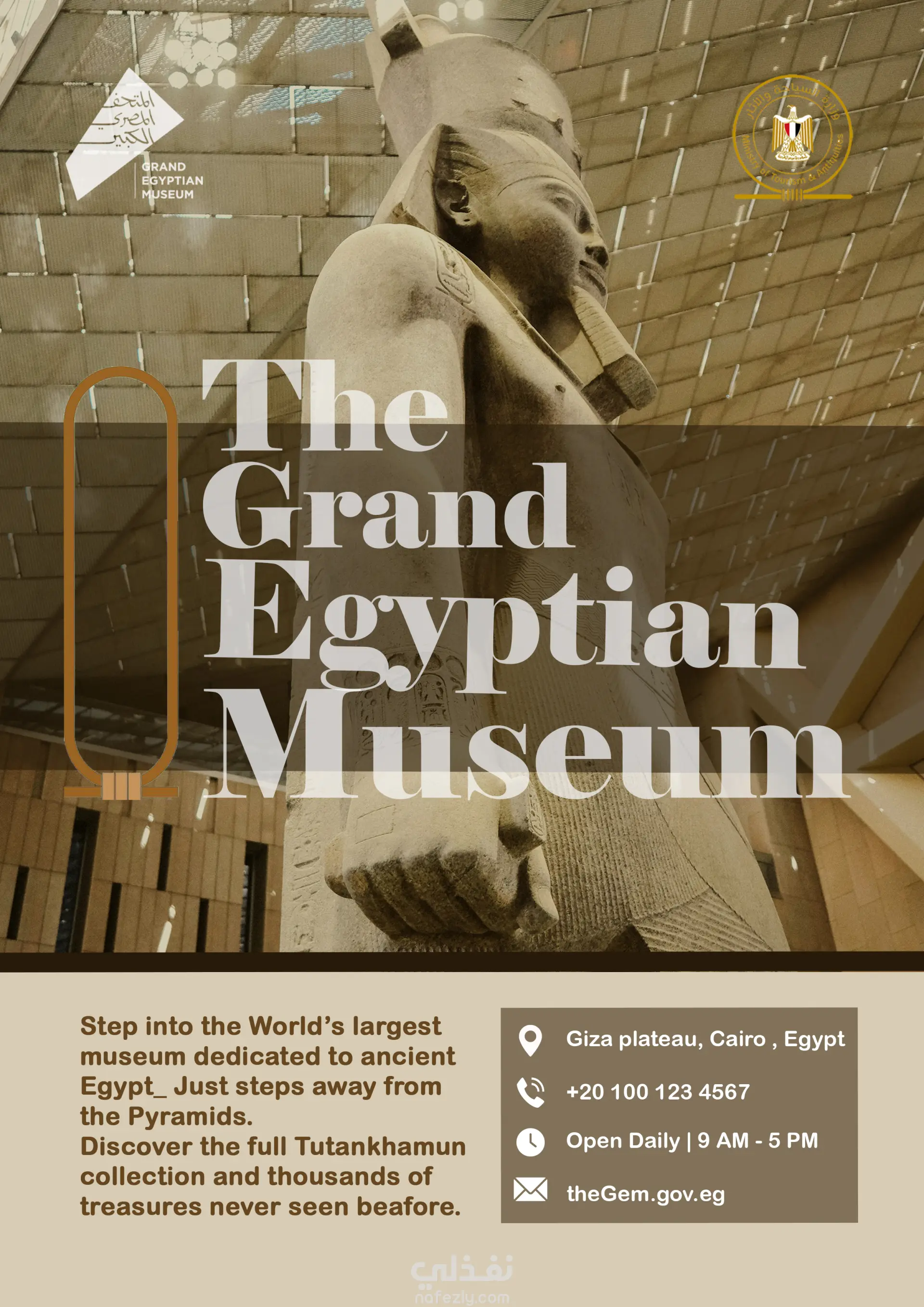 بوستر إعلاني للمتحف المصري الكبير يسلط الضوء على عراقة الحضارة المصرية العظيمة، ويعكس قيم الأصالة والتاريخ في قالب بصري حديث. التصميم يهدف إلى إبراز المتحف كصرح ثقافي عالمي يجمع بين التراث العريق والعرض المعاصر، ليمنح الزائر إحساساً بالفخر والانتماء مع دعوة لاكتشاف روائع مصر القديمة.