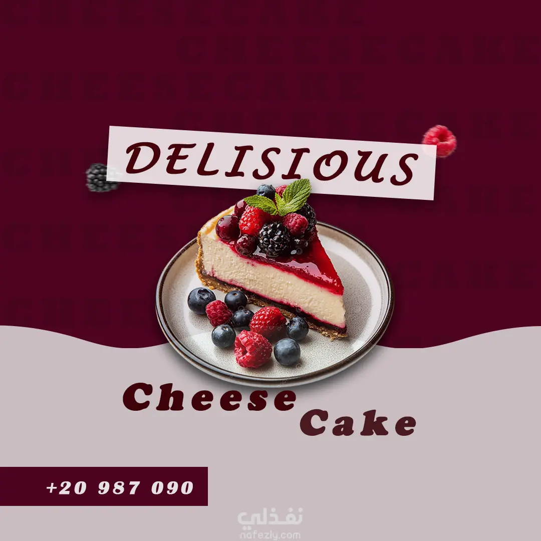 تصميم إعلاني لمحل تشيز كيك يهدف إلى إبراز الطابع اللذيذ والجذاب للحلويات، مع استخدام عناصر بصرية تحفّز الشهية وتشد الانتباه.