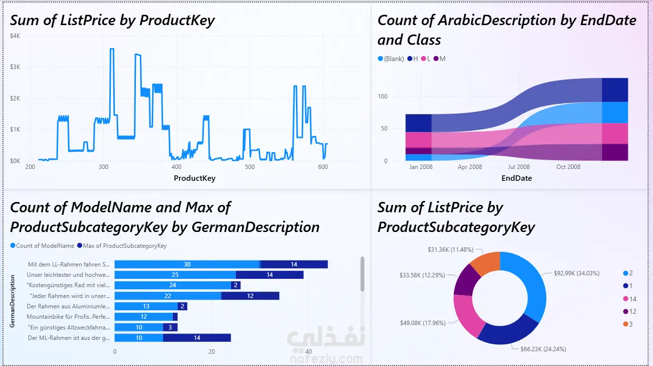 أسفل يسار (Bar chart): بيوضح عدد ModelName وأقصى قيمة لـ ProductSubcategoryKeyحسبGermanDescription. بعض الأوصاف الألمانية عندها عدد كبير زي أول وصف (30 + 14).