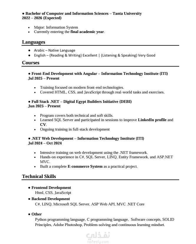 التصميم بسيط ومنظم، مع تنسيق يعرض الخبرات والمهارات بوضوح، ومناسب للتقديم على الوظائف المحلية والدولية.