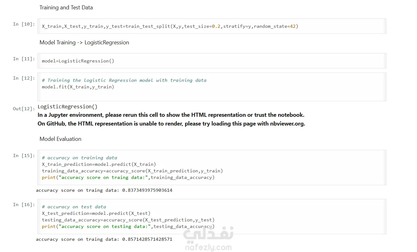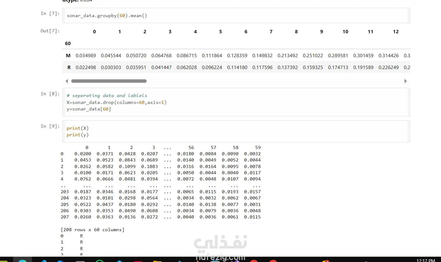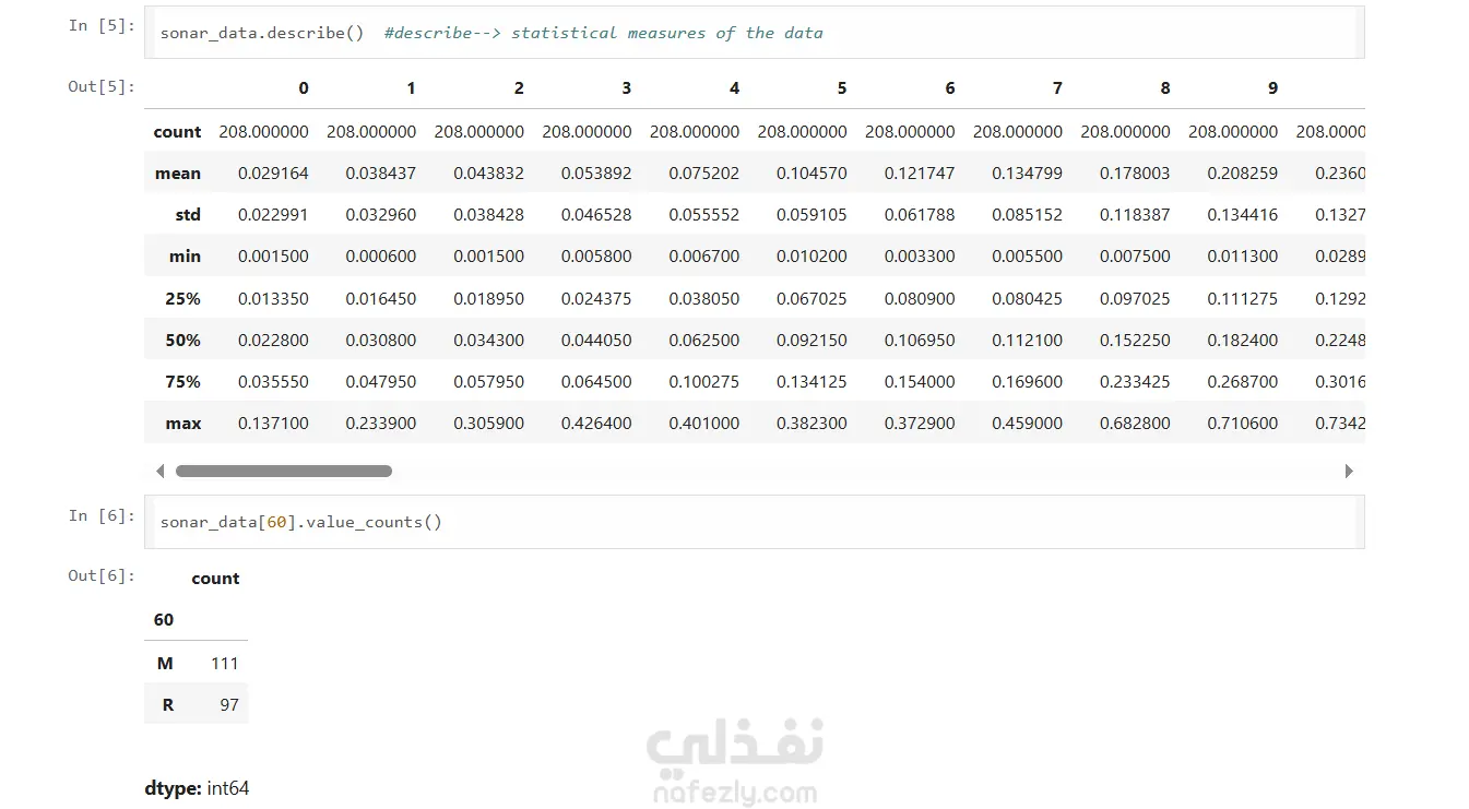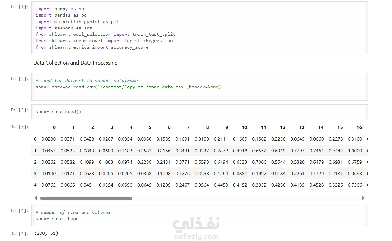 مشروع عملي يهدف إلى تصنيف الإشارات الصوتية (Sonar Signals) وتمييز ما إذا كانت تعود إلى صخور (Rock) أو ألغام/أسطوانات معدنية (Mine) باستخدام خوارزميات تعلم الآلة. تفاصيل المشروع: مصدر البيانات: UCI Machine Learning Repository – Sonar Dataset عدد العينات: 208 عينة عدد الخصائص: 60 ميزة (قراءات الإشارات الصوتية) المتغير المستهدف: Rock (R) أو Mine (M) خطوات العمل: استيراد المكتبات اللازمة ومعالجة البيانات. تقسيم البيانات إلى مجموعة تدريب واختبار. تدريب عدة نماذج مثل الانحدار اللوجستي (Logistic Regression) و شجرة القرار (Decision Tree). تقييم النماذج باستخدام دقة التصنيف (Accuracy Score) النتائج: حقق النموذج دقة تنبؤ وصلت إلى حوالي 85% على بيانات الاختبار، ما يجعله مشروعًا تعليميًا مميزًا لفهم أساسيات تعلم الآلة والتصنيف العملي.