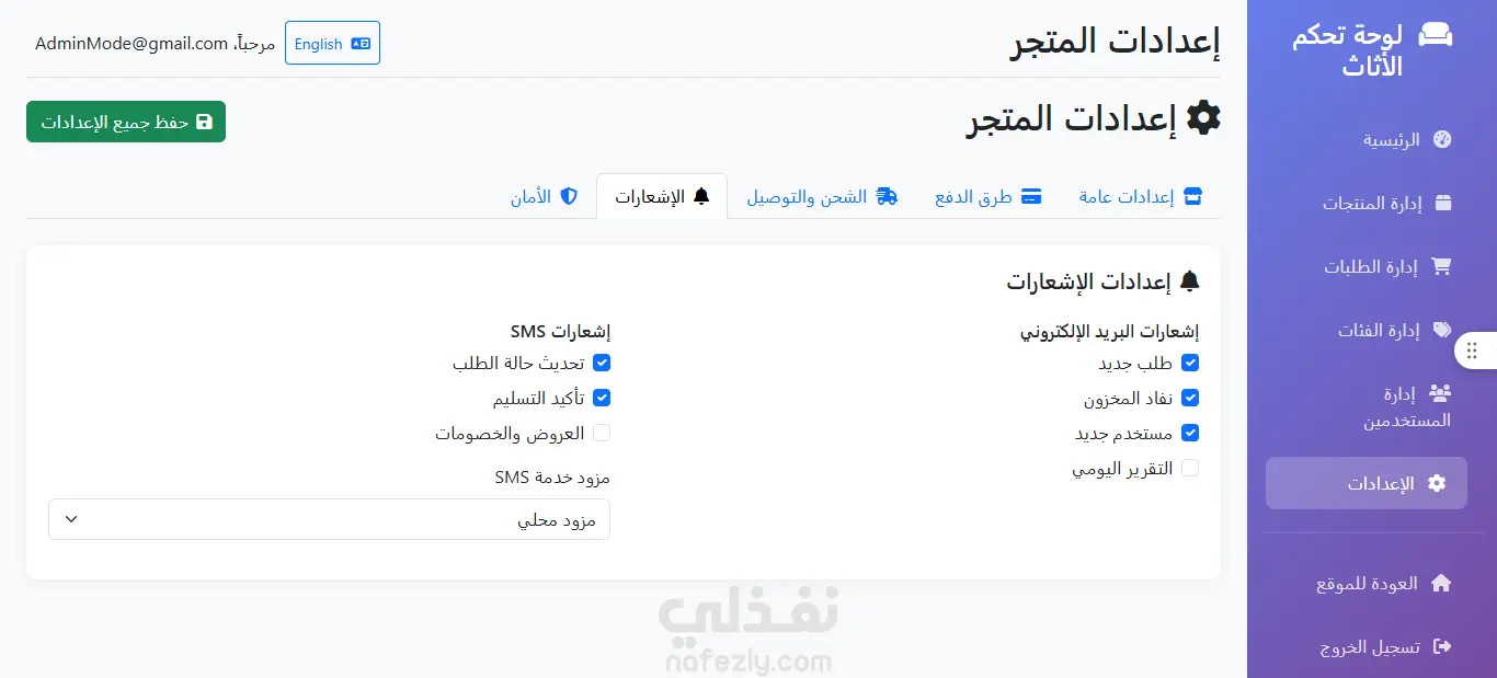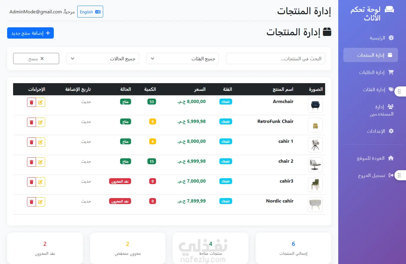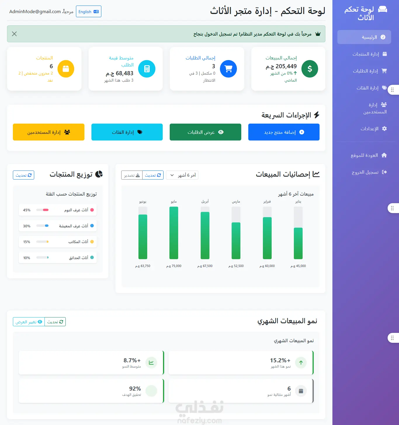 - **لوحة إدارة متقدمة**: نظام إدارة شامل للمنتجات، الطلبات، والمبيعات مع إحصائيات تفاعلية ونماذج بيانية لمراقبة الأداء.