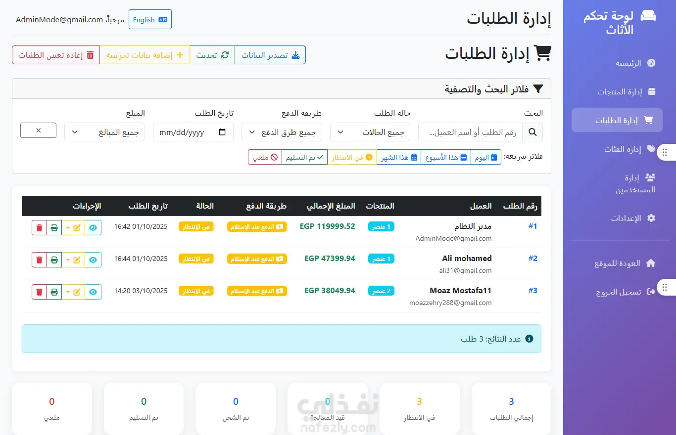 - **إدارة المخزون والطلبات**: تتبع حالة الطلبات (في الانتظار، قيد المعالجة، تم الشحن، تم التسليم) مع فلاتر ذكية وإمكانية الحذف.