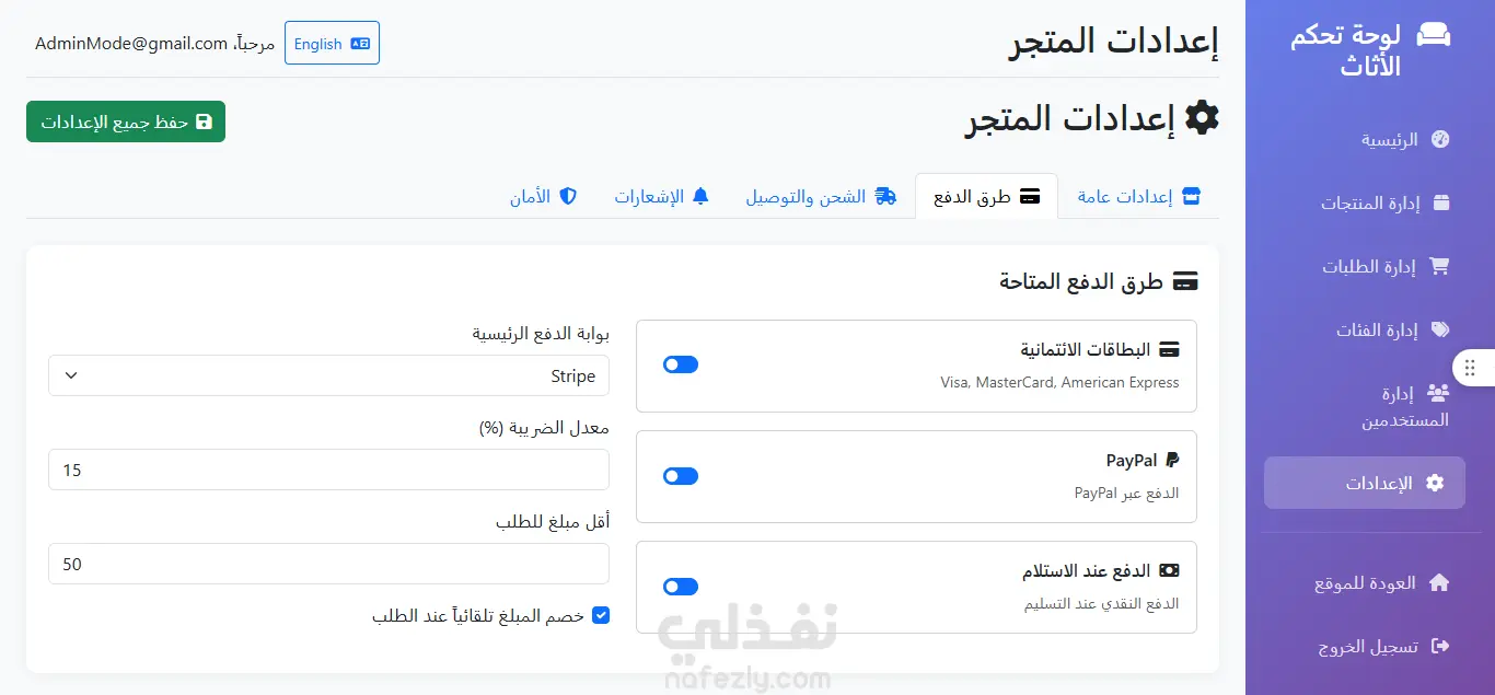 - **نظام الدفع المتكامل**: دعم طرق دفع متعددة (بطاقة ائتمان، PayPal، الدفع عند الاستلام) مع تأكيدات آمنة.
