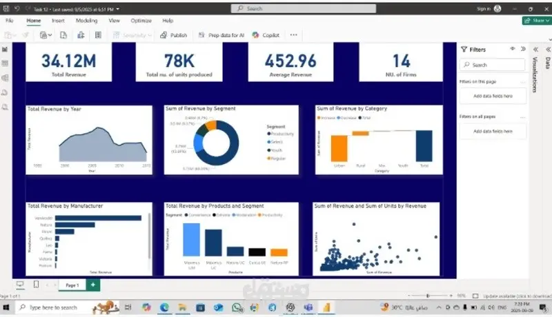 هذا التقرير يعرض لوحة تحكم توضح أداء اكبر الشركات الكندية من خلال الإيرادات والإنتاج. تظهر المؤشرات الأساسية أن إجمالي الإيرادات بلغ 34.12 مليون، بينما وصل عدد الوحدات المنتجة إلى 78 ألف وحدة، بمتوسط إيرادات 452.96، ومن خلال 14 شركة مشاركة. يوضح الرسم الزمني للإيرادات تطور الإيرادات عبر السنوات من 1995 حتى 2015، حيث يظهر نمو ملحوظ في البداية ثم تقلبات في السنوات اللاحقة. بالنظر إلى توزيع الإيرادات حسب القطاعات، يتضح أن قطاع **Regular** استحوذ على النسبة الأكبر بحوالي 68% من إجمالي الإيرادات، يليه قطاع **Youth** ثم **Select** وأخيراً **Productivity**. أما من حيث التصنيف حسب الفئات، فإن الفئة الحضرية **Urban** ساهمت بشكل أساسي في زيادة الإيرادات مقارنة بالفئات الأخرى مثل الريفية والمختلطة. بالنسبة للمصنّعين، حققت شركة **VanArsdel** أعلى الإيرادات مقارنة بباقي الشركات مثل Natura وPirum وQuibus، بينما جاءت شركات أخرى مثل Leo وFama وVictoria وPomum بإيرادات أقل بكثير. كما يعرض التحليل الإيرادات حسب المنتجات والقطاعات، حيث برزت منتجات مثل **Maximus UM** و**Maximus UC** في المقدمة مقارنة بمنتجات أخرى. أخيراً، يوضح المخطط المبعثر العلاقة بين عدد الوحدات والإيرادات، مما يساعد في تحديد الأنماط بين حجم الإنتاج ومستوى الإيرادات.