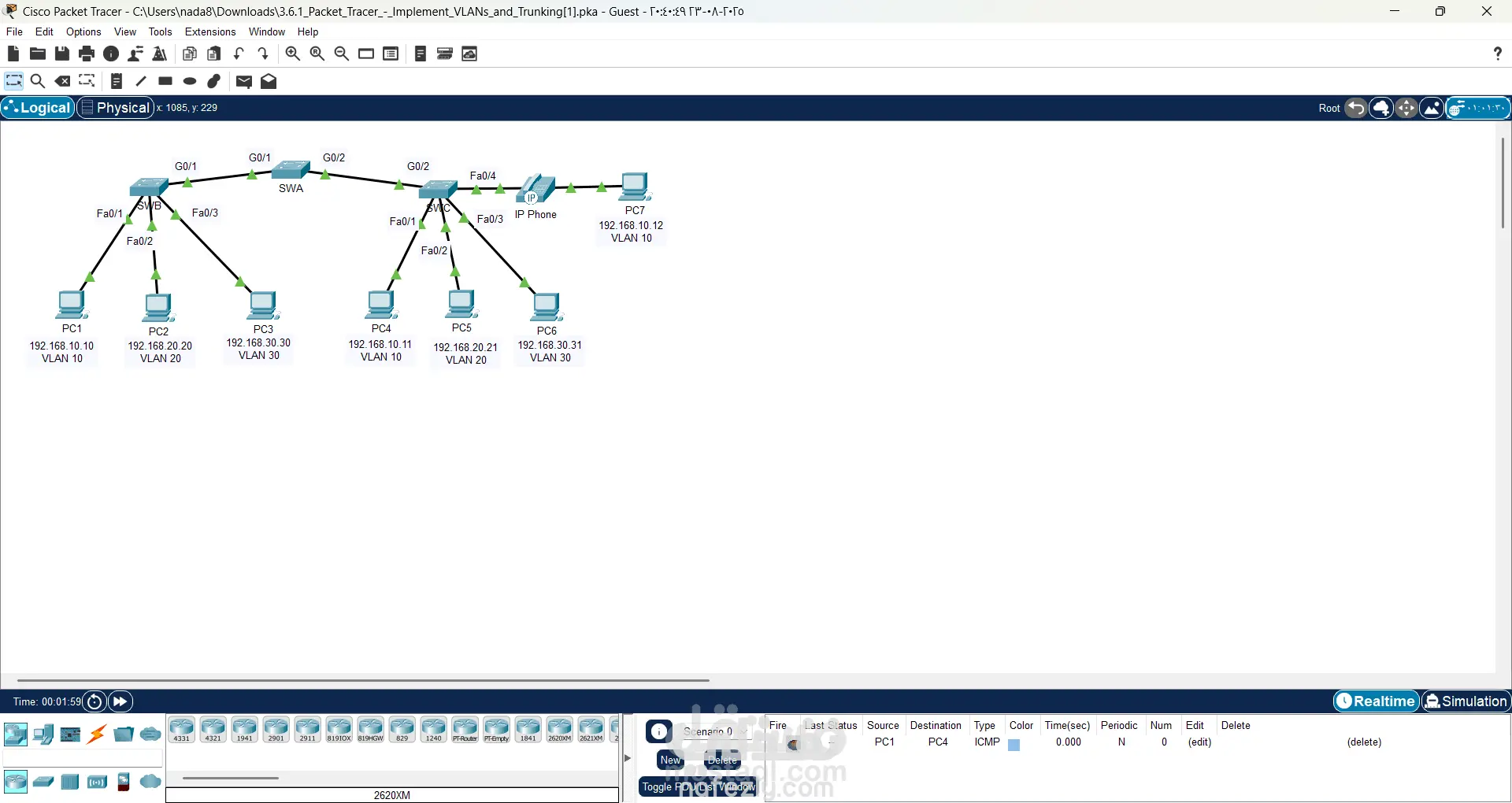 إعداد VLANs وعمل Trunking بين السويتشات.