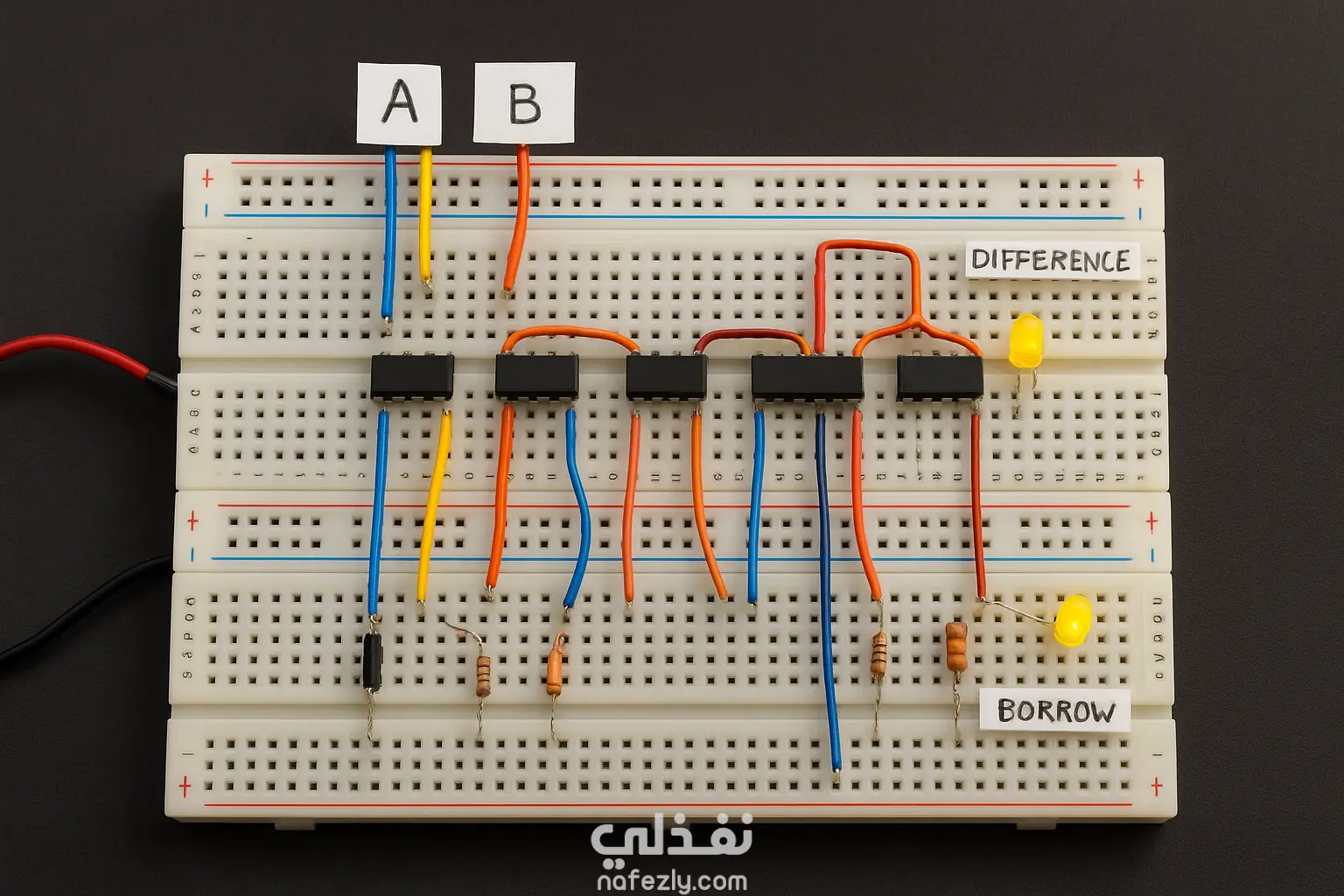 مشروع دائرة منطقية على Breadboard: طرح ثلاثة أعداد ثنائية (Binary Subtractor — 3-input)