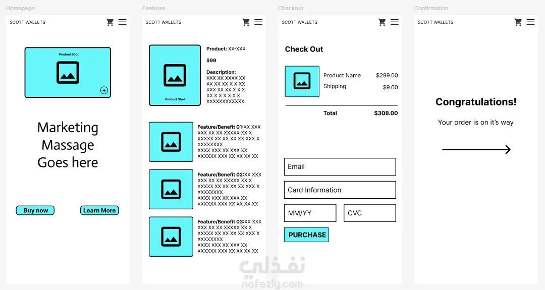 هذه سلسلة من أربع وايرفريمز لتطبيق هاتف محمول مخصص لمتجر إلكتروني يحمل اسم "Scott Wallets". الوايرفريم الأول (Homepage) يمثل الصفحة الرئيسية، ويحتوي على مساحة كبيرة لعرض المنتج برسالة تسويقية قوية أسفله وزري "Buy now" و "Learn More". الوايرفريم الثاني (Features) هو صفحة تفاصيل المنتج، حيث تُعرض صور المنتج وسعره ووصفه، بالإضافة إلى ثلاثة أقسام مفصلة تعرض الميزات والفوائد الأساسية. الوايرفريم الثالث (Checkout) هو صفحة الدفع، ويُلخص المنتج وإجمالي السعر (يشمل الشحن) ويطلب من المستخدم إدخال البريد الإلكتروني وتفاصيل بطاقة الدفع (MM/YY و CVC). أما الوايرفريم الأخير (Confirmation) فهو صفحة التأكيد، ويظهر رسالة تهنئة "Congratulations!" تُعلم العميل بأن طلبه قيد التنفيذ. يحتوي الشريط العلوي لجميع الشاشات على شعار المتجر وأيقونتي سلة التسوق والقائمة.