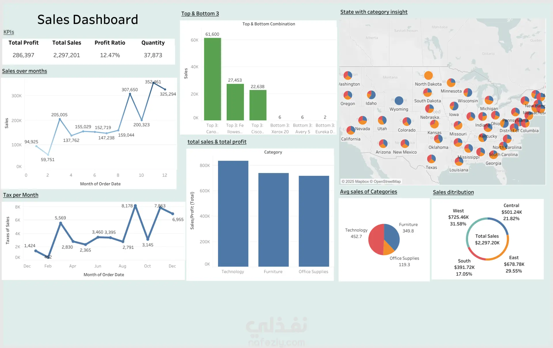 تعرض المقاييس الرئيسية في الأعلى مثل: إجمالي الربح (Total Profit)، إجمالي المبيعات (Total Sales)، نسبة الربح (Profit Ratio)، والكمية المباعة (Quantity).