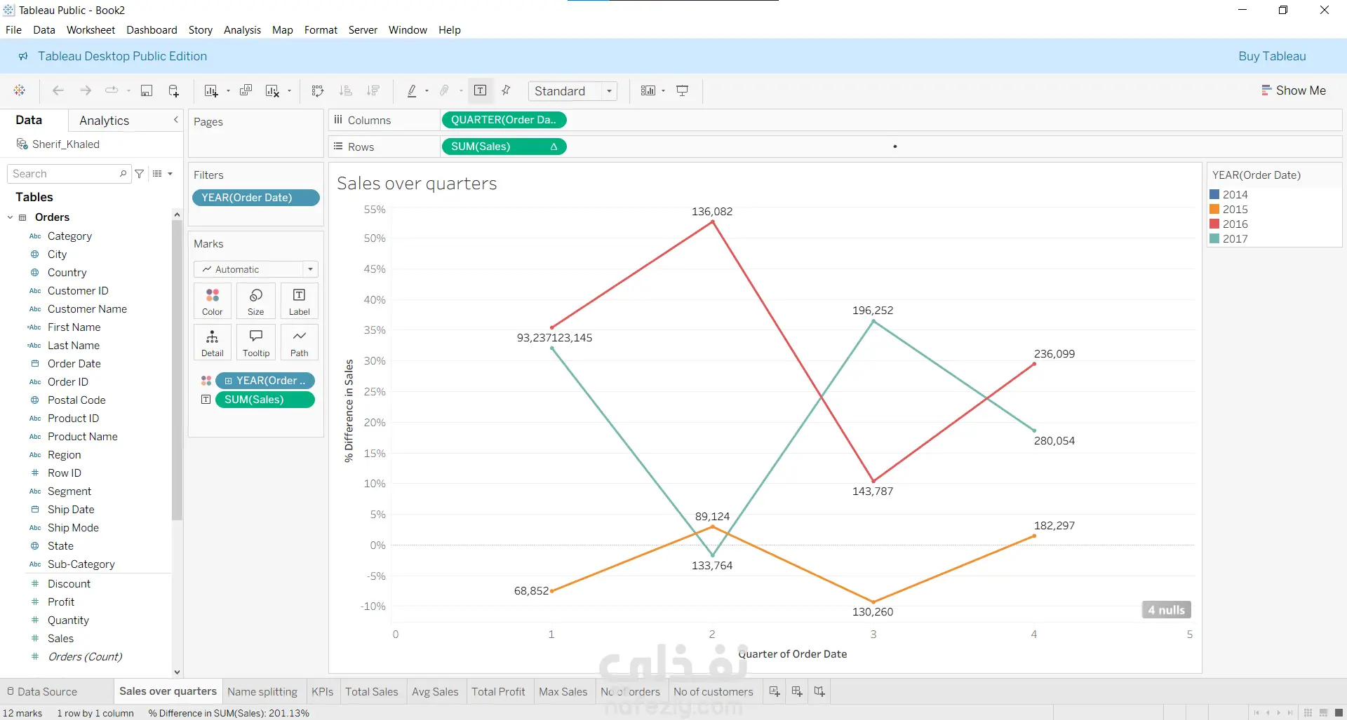 Sales over Quarters: مرئية تحليلية منفصلة لتتبع نسبة التغير في المبيعات سنوياً على مدار أرباع السنة (Q1، Q2، Q3، Q4).