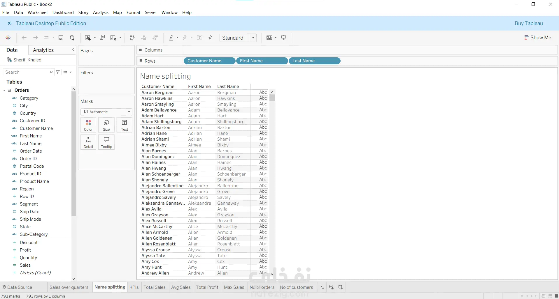 Name Splitting: ورقة عمل تظهر عملية تنظيف وتجهيز البيانات مثل فصل الاسم الأول والأخير للعملاء.