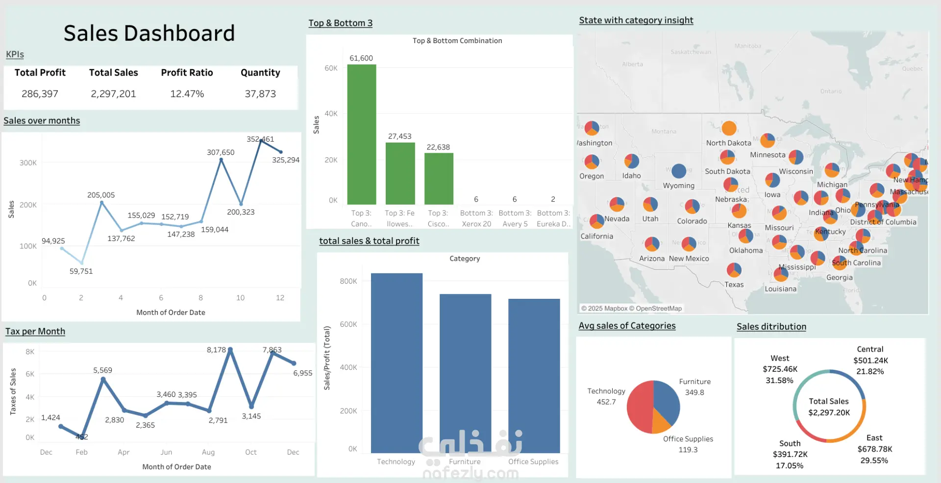 توزيع المبيعات حسب المنطقة (Sales Distribution): يوضح نسبة ومجموع المبيعات في المناطق الرئيسية (مثل: الغرب، الوسط، الجنوب، الشرق).
