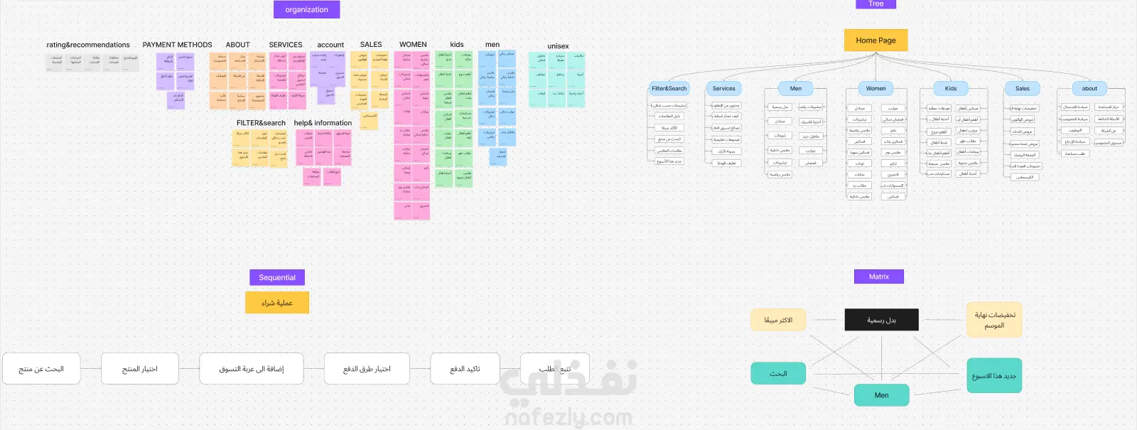 هذه خريطة معمارية معلوماتية (IA) شاملة لتنظيم محتوى وتنقل متجر إلكتروني لبيع الملابس. يُظهر قسم التنظيم (Organization) تجميعاً منطقياً لصفحات الموقع تحت فئات رئيسية مثل الرجال، النساء، المبيعات، وخدمات الحساب والدفع. يوضح الهيكل الشجري (Tree) التسلسل الهرمي للملاحة بدءاً من الصفحة الرئيسية وتفرعه إلى فئات فرعية للمنتجات كالأحذية والإكسسوارات ضمن كل قسم. يُفصل الجزء التتابعي (Sequential) مسار المستخدم لإتمام "عملية الشراء"، بدءاً من البحث واختيار المنتج وصولاً إلى تأكيد الدفع. تُغطي هذه الخطوات إجراءات أساسية مثل إضافة المنتج إلى عربة التسوق وتتبع الطلب بعد إتمامه. أخيراً، يوضح نموذج المصفوفة (Matrix) العلاقات المتقاطعة بين أقسام الموقع والعروض الترويجية، مثل تخفيضات نهاية الموسم.
