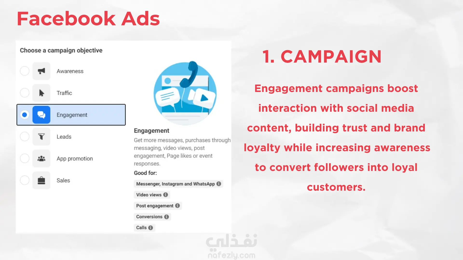 Awareness Content: بوستات بتعرّف الجمهور بالبراند والخدمة/المنتج وبتزود الوعي بيها. Engagement Content: محتوى هدفه التفاعل (أسئلة – Polls – مسابقات – تريندات – محتوى جذاب يزود التعليقات والشير). Sales Content: منشورات وإعلانات بتركز على البيع المباشر وتحويل المهتمين لعملاء فعليين. بعدها بعمل الاعلانات المموله (بعد مكون عملت الاستراتيجية اللي هتخليني اقدر اعمل الإعلان)