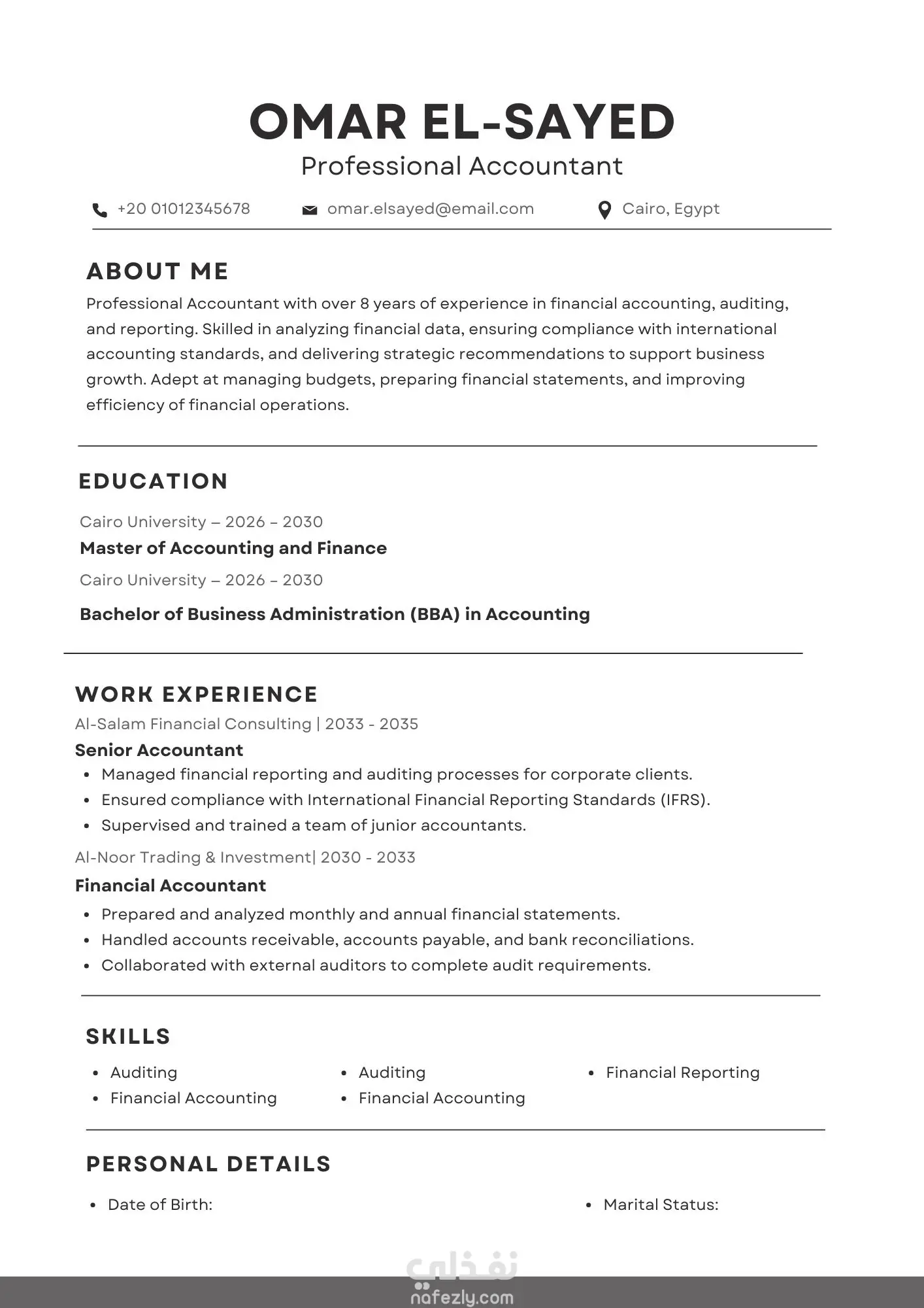 قمت بإنشاء سيرة ذاتية مكونة من صفحة واحدة بتصميم منسق يشمل: بيانات شخصية واضحة. خبرات ومهارات بشكل مرتب. استخدام تنسيق بسيط وأنيق جاهز للتقديم.